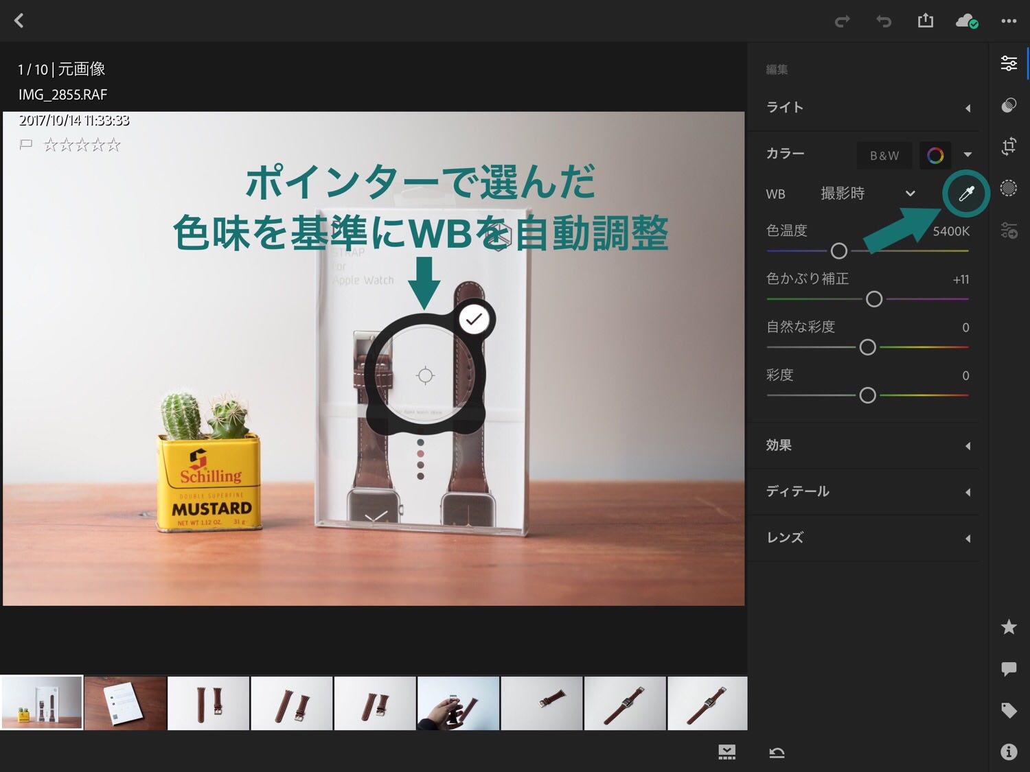 画面右側のスポイトアイコンをタップすると出てくるポインターを動かし、本来白である部分にポインターを持って行くと、指定した色味を基準として自動でWBを調整してくれます。