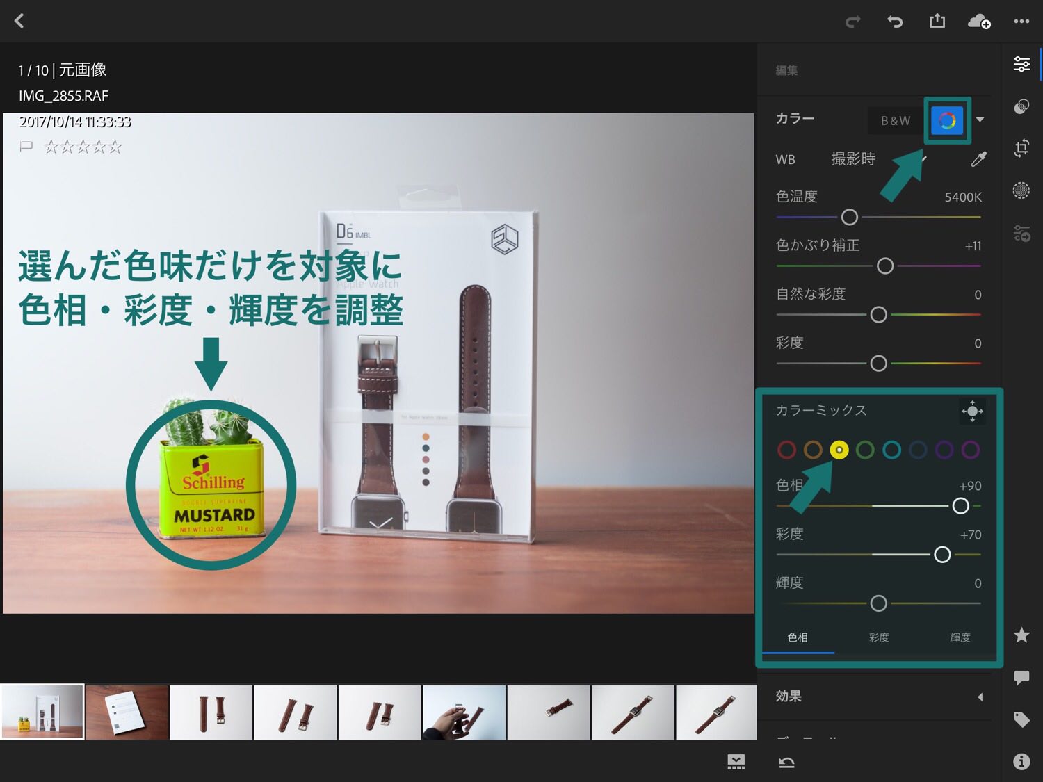 これによって「黄色とオレンジの中間色のここの色味だけを編集したい」という細かい操作が可能になります。