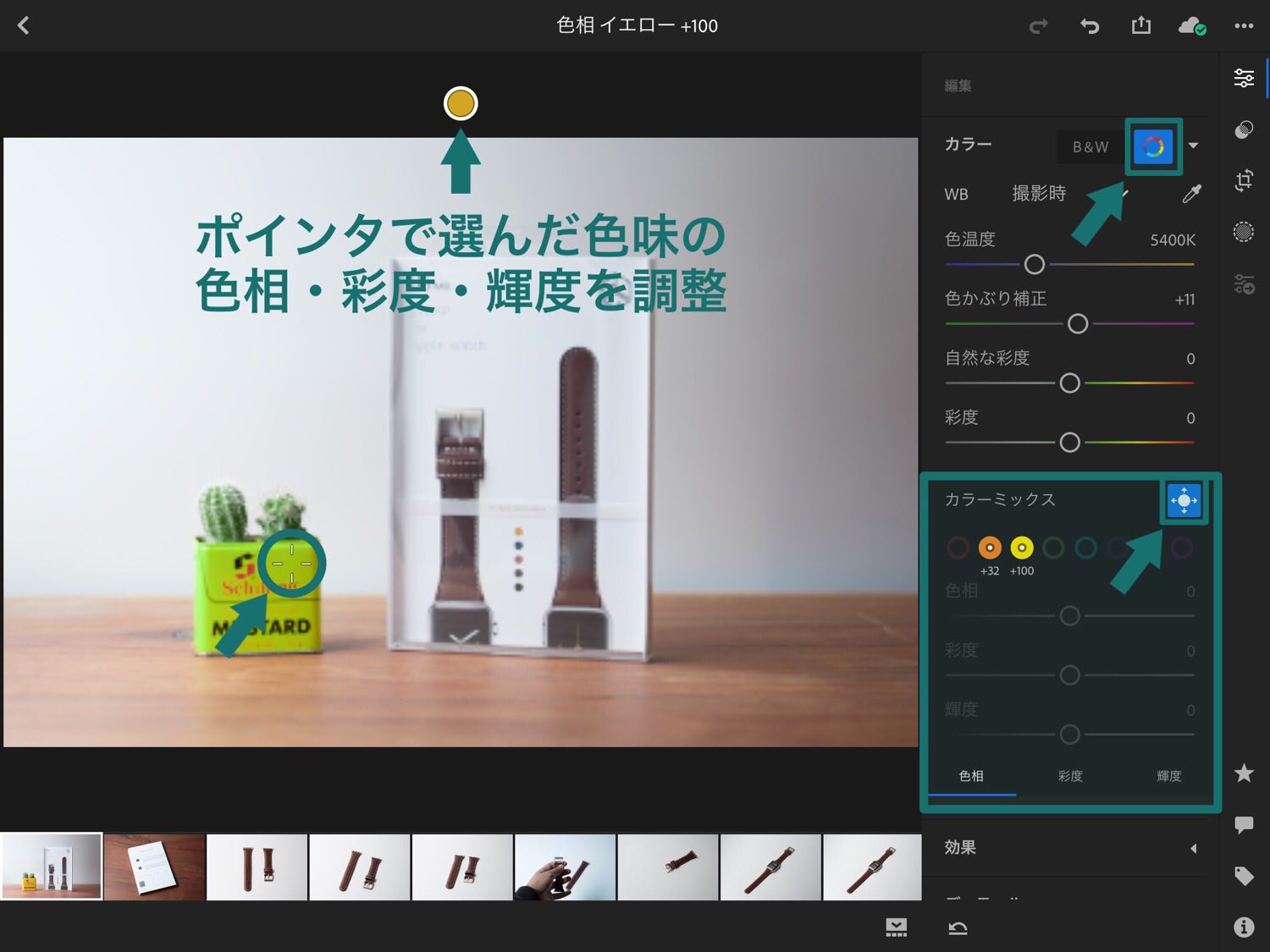 さらにカラーミックスの横にあるジョイスティックのようなアイコンをタップすると、画面内に十字型のポインタが出現。これを好きな場所に動かすと、ポインタが指定する色味だけを対象に色相・彩度・輝度を調整できます。