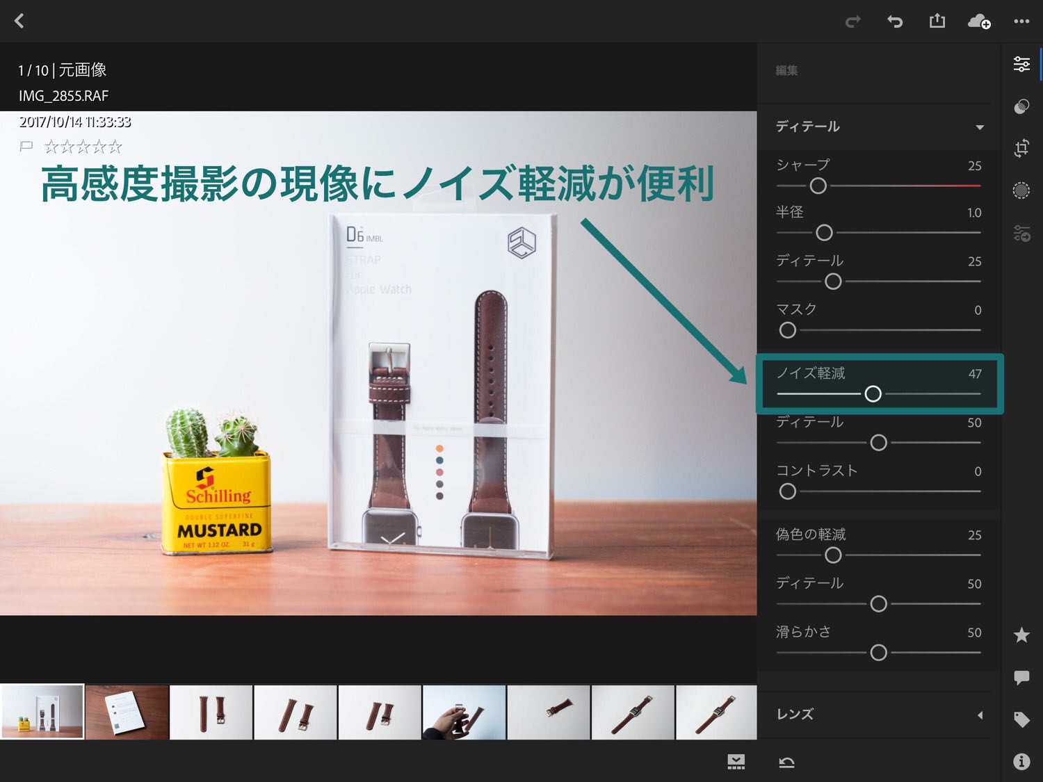 色味編集で細かい話が続いたので、ここからは簡単に。Ligthroom CCではディテールの項目にあるノイズ軽減が便利。