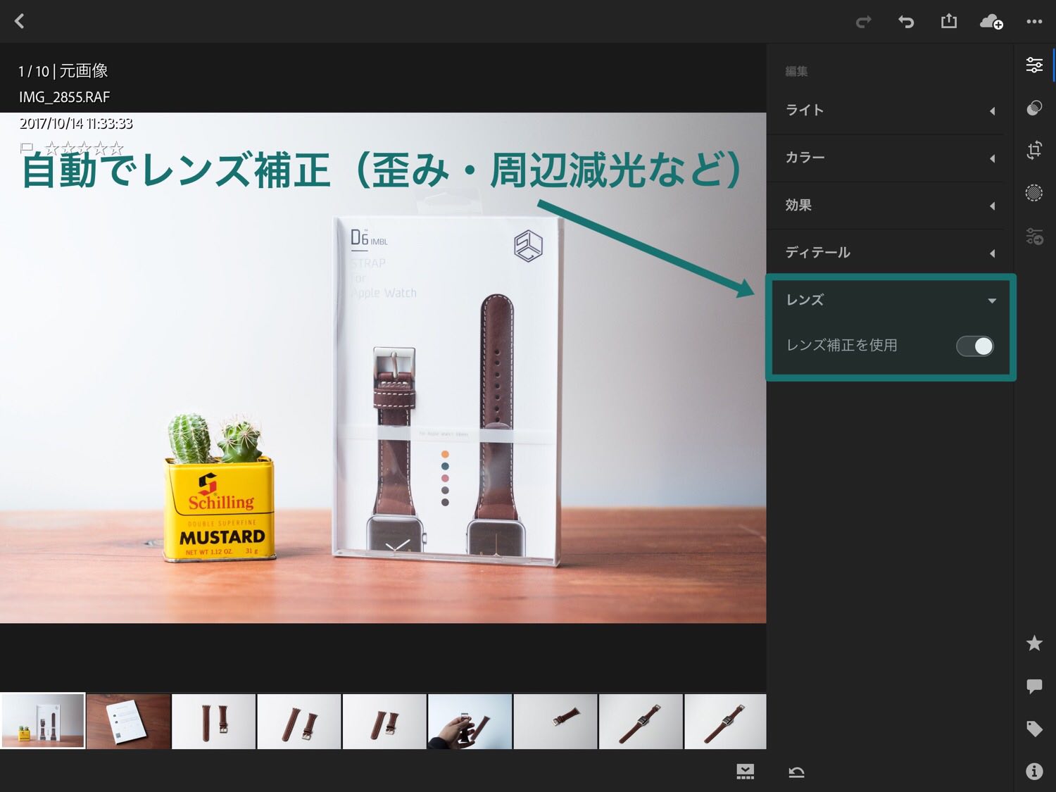 上でも軽く紹介したレンズ補正。オンにすると自動でレンズに合わせて歪みや周辺減光を補正してくれます。特に広角レンズで撮影した写真では効果を発揮します。