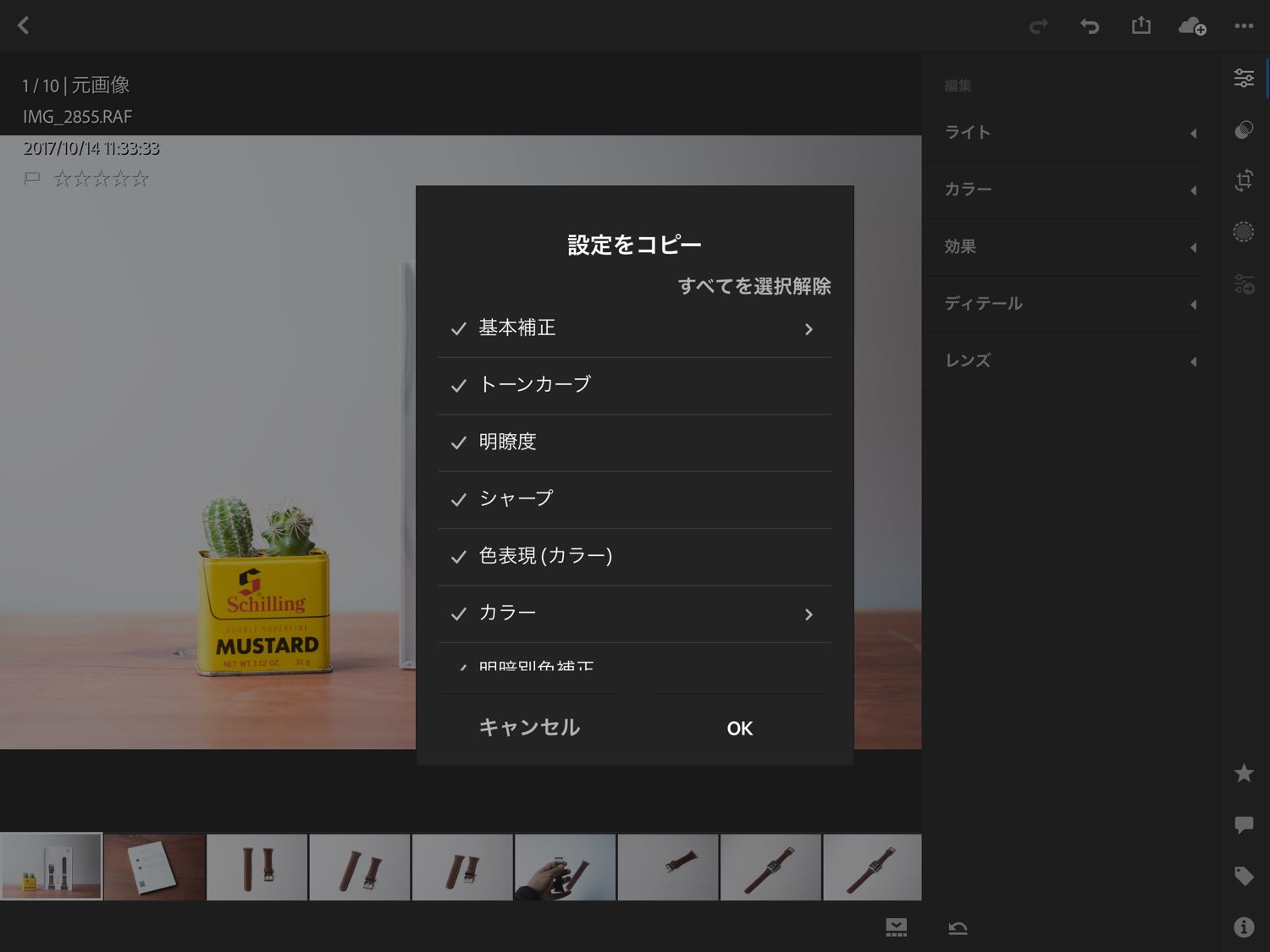 VSCOでもコピペ機能はあったのですが、Ligthroom CCは傾きやトリミング、部分補正の内容まで全てコピペ出来るのが便利。さらにコピーする編集内容を項目ごとに取捨選択できるのも使い勝手が良いです。