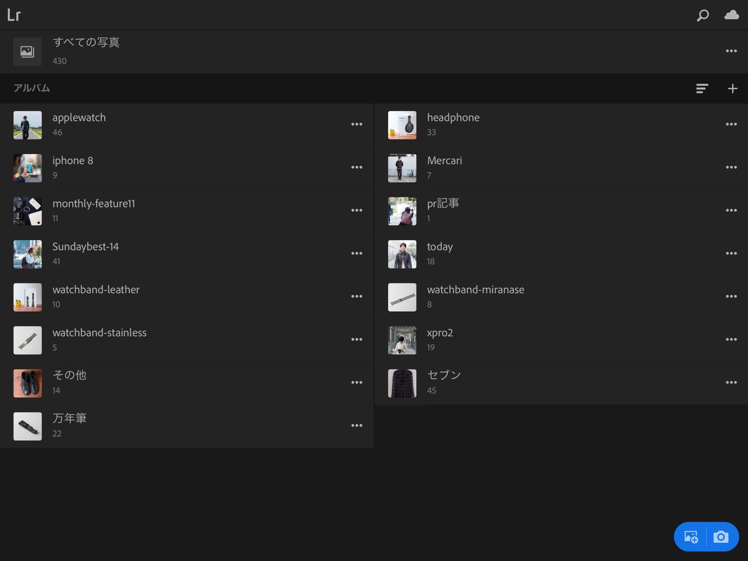 Lightroom CCは単なる現像ツールであるだけでなく、写真の管理にも長けています。取り込んだ写真は上の画像のようにアルバムとしてまとめて管理ができます。