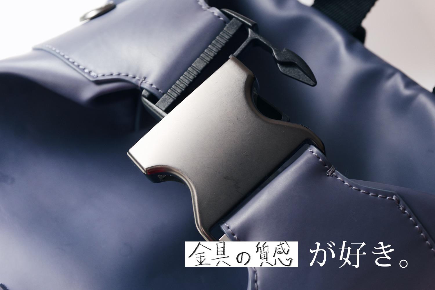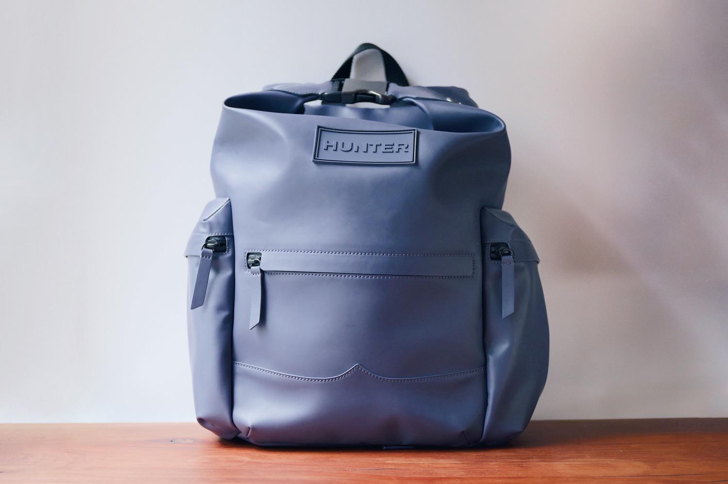 HUNTERのラバー加工されたレザーバックパックは、上部にある留め金具の質感が好き。