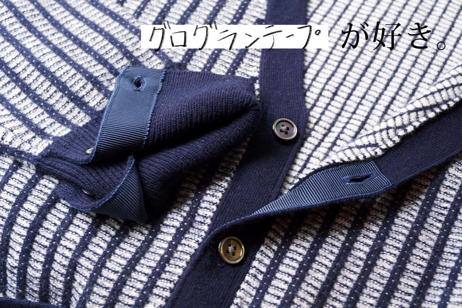 袖口やフロントボタンの裏に貼ったグログランテープは、ニットが伸びて緩くなりがちなボタンホールの耐久性を高める役割を担っています。テープ自体に厚みがあるので前を開けて羽織っていてもヨレが少なく、凛とした印象を保ってくれる効果も。