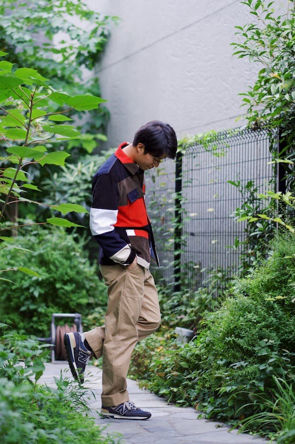 チノパン+スニーカーというアメカジ色の強いボトムスコーデが、色鮮やかなMAISON KITSUNÉのジャケット持ってくることで全体に上品な印象に。