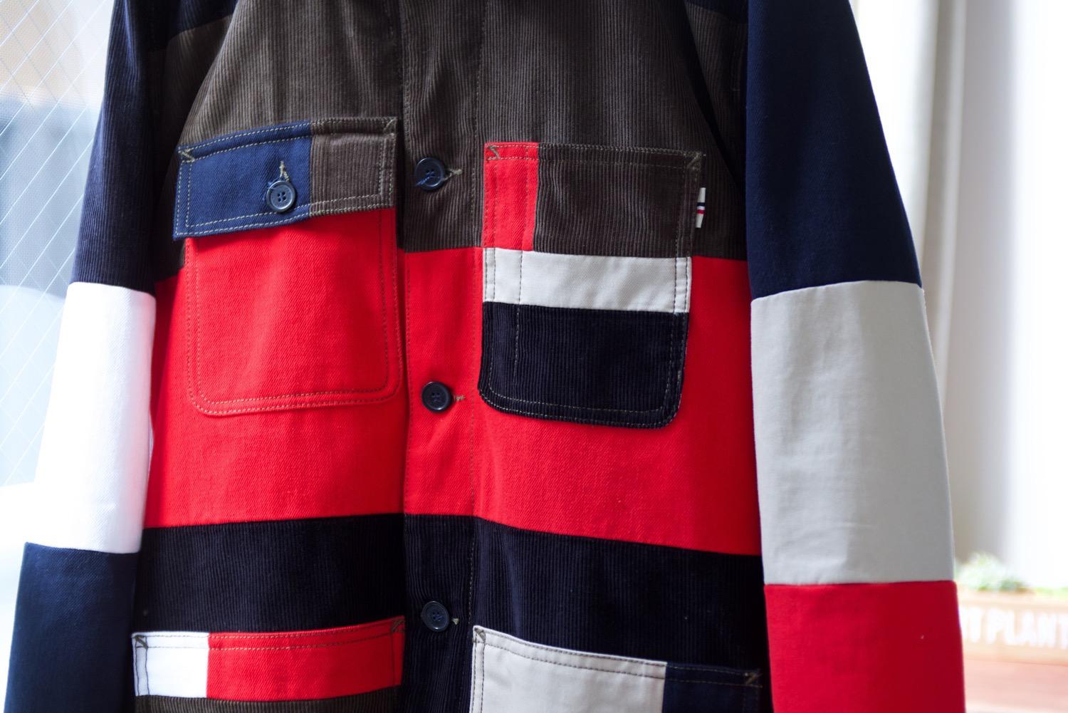 襟元やポケットなど細かい部分も生地がパッチワークされていて凝った作り。