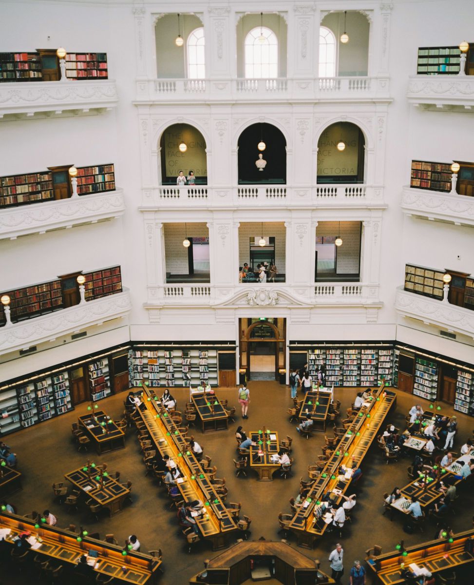 「死ぬまでに1度は行きたい図書館」と言われるヴィクトリア州立図書館。ドーム状になった読書室は、中心から放射状にデスクが並ぶファンタジー映画のような空間。6階の廊下からその空間を見下ろすこともでき、フォトスポットとして観光地にもなっています。