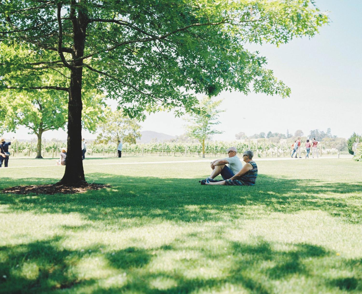 敷地内の芝生でゆったりとくつろぐ人も。日本で芝生は見るための場所で立ち入り禁止されていることが多いですが、オーストラリアで芝生は寝転がったりサッカーをして憩うための場所なのが対照的でした。