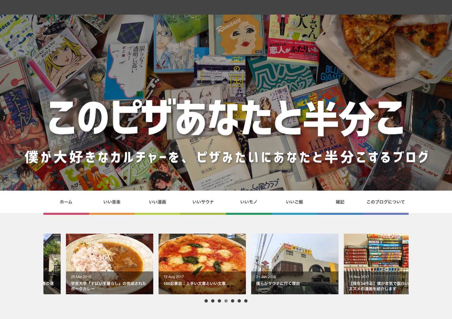 もう1人はカルチャーを愛しカルチャーに愛された男ピザが運営する「このピザあなたと半分こ」。独自の着眼点と類まれな文章力を持つクレイジー野郎です。