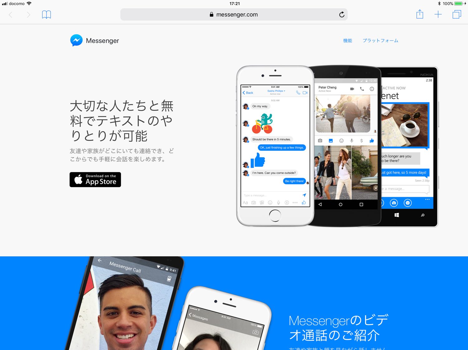 まずはSafariなどでhttps://www.messenger.comのサイトへアクセス。するとiOSの場合はブラウザ版ではなくアプリをDLするよう促すページが表示されます。