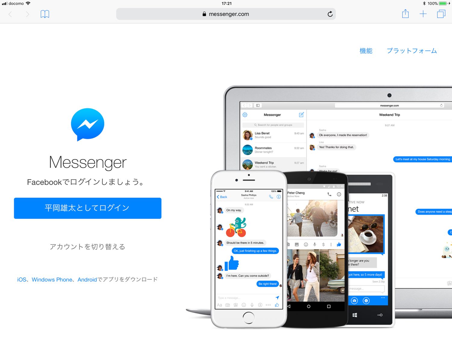するとこのようにPCと同様にブラウザ版のMessenger画面にログインするページが現れます。ログインするとそのままSafariブラウザ上でMessengerを利用することができいます。