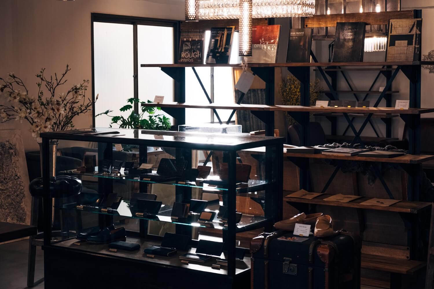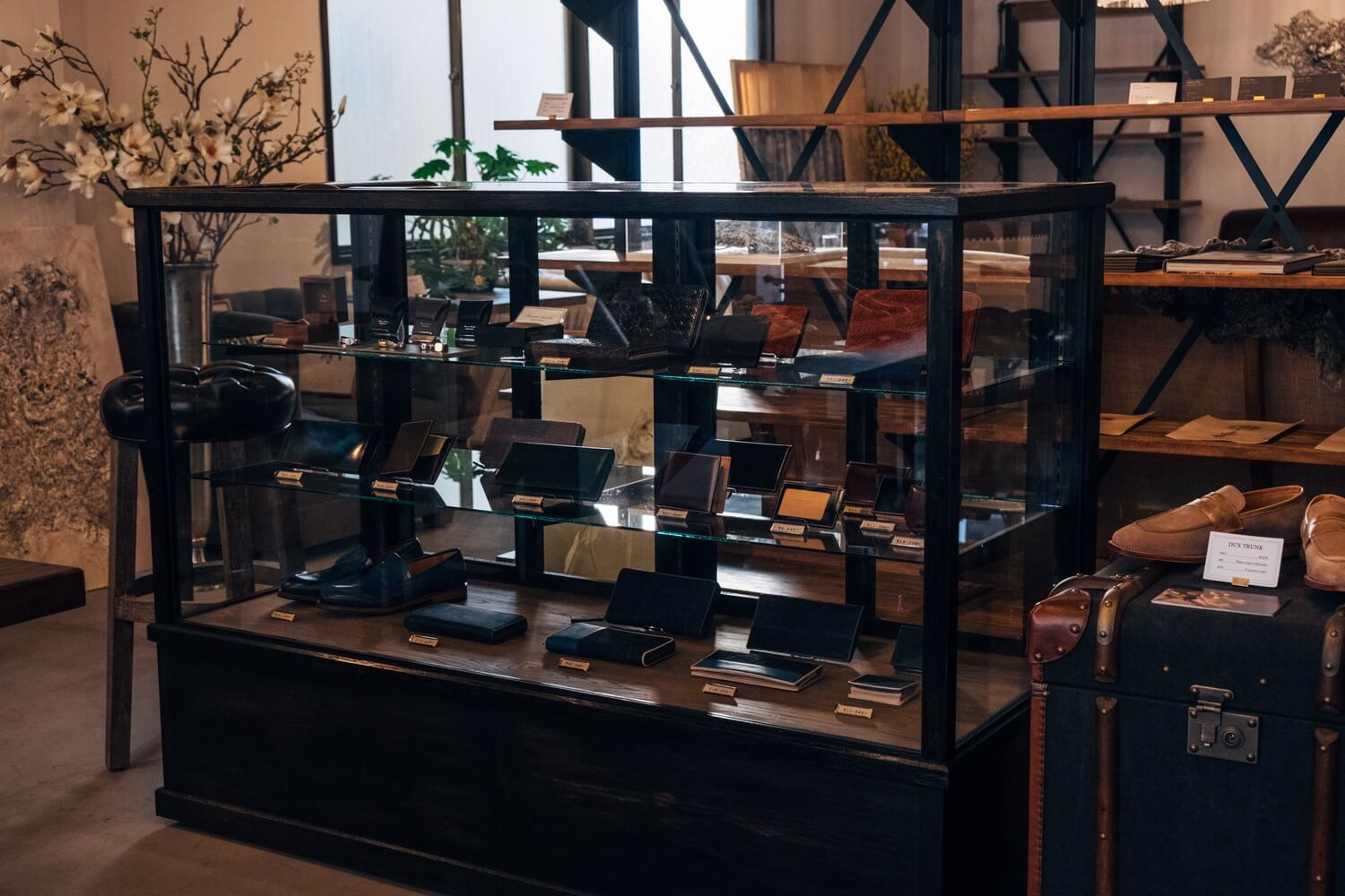 リアルなアンティーク調の風合いを再現した棚の中に大切に並べられたこだわりの革小物の数々。知らずに訪れるとTOWARDSが財布も作っていると勘違いしてしまいそうなくらい違和感のない空間