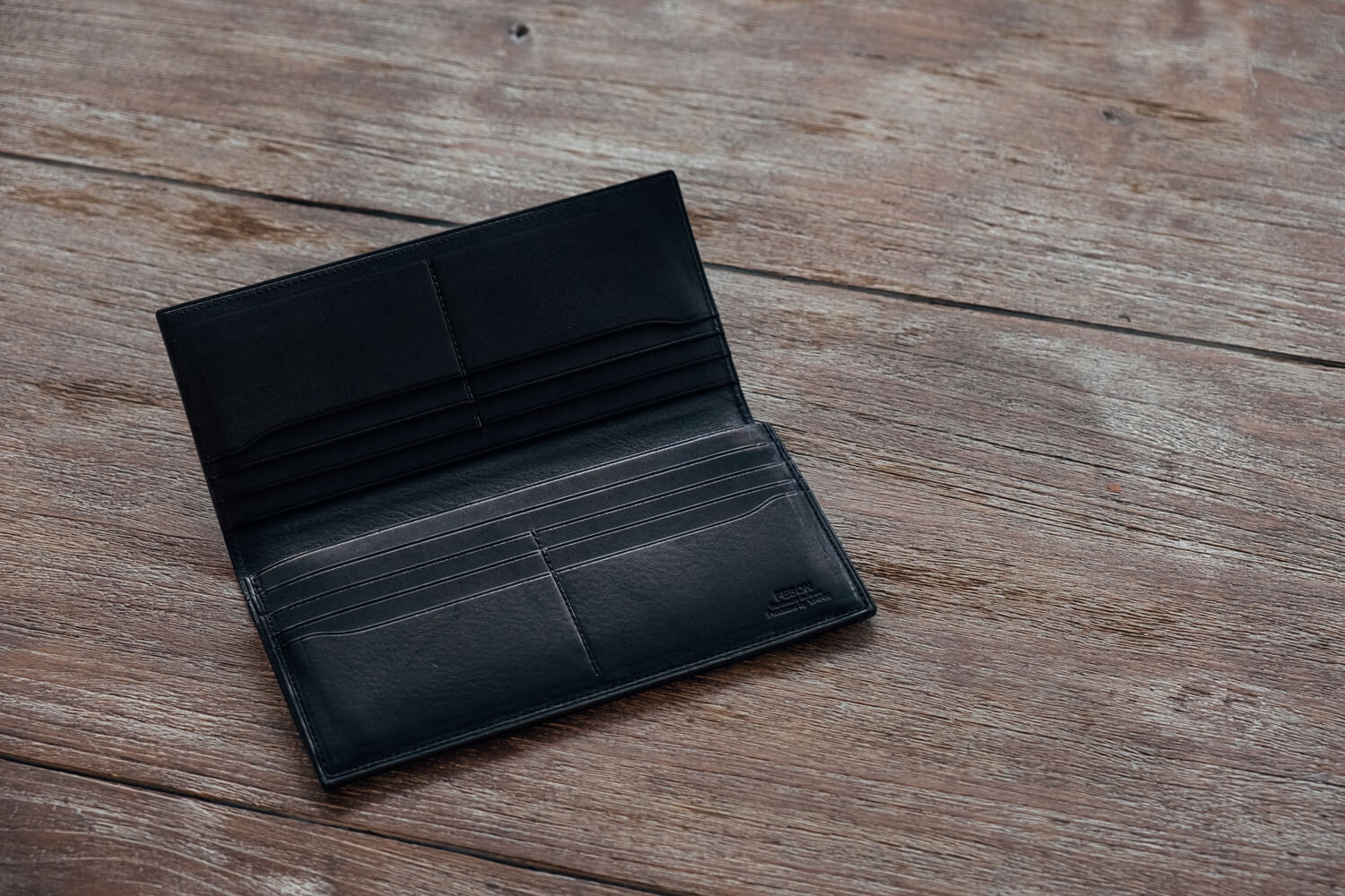 通常はヌメ革で内装が作られているFESONの長財布。マットなブラック内装はMLSの別注モデルです。