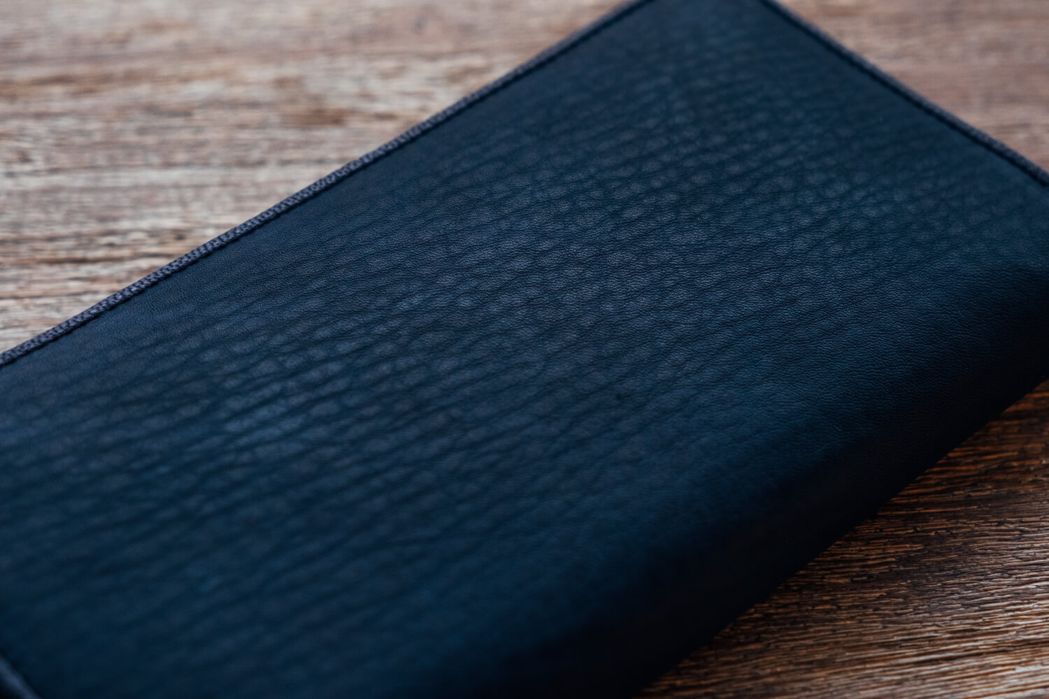 写真右側の財布はFESONというブランドのアドバンレザーを用いた長財布。牛革を磨くことで独特の美しいムラ感を表現した、上品な印象の財布です。