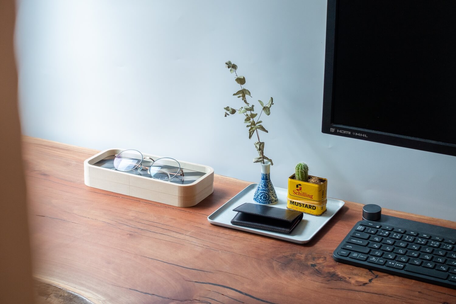 MOHEIMのPEN TRAYを使って整理した今のデスクはこんな感じ。一枚板の木のデスクとの相性も良いです。
