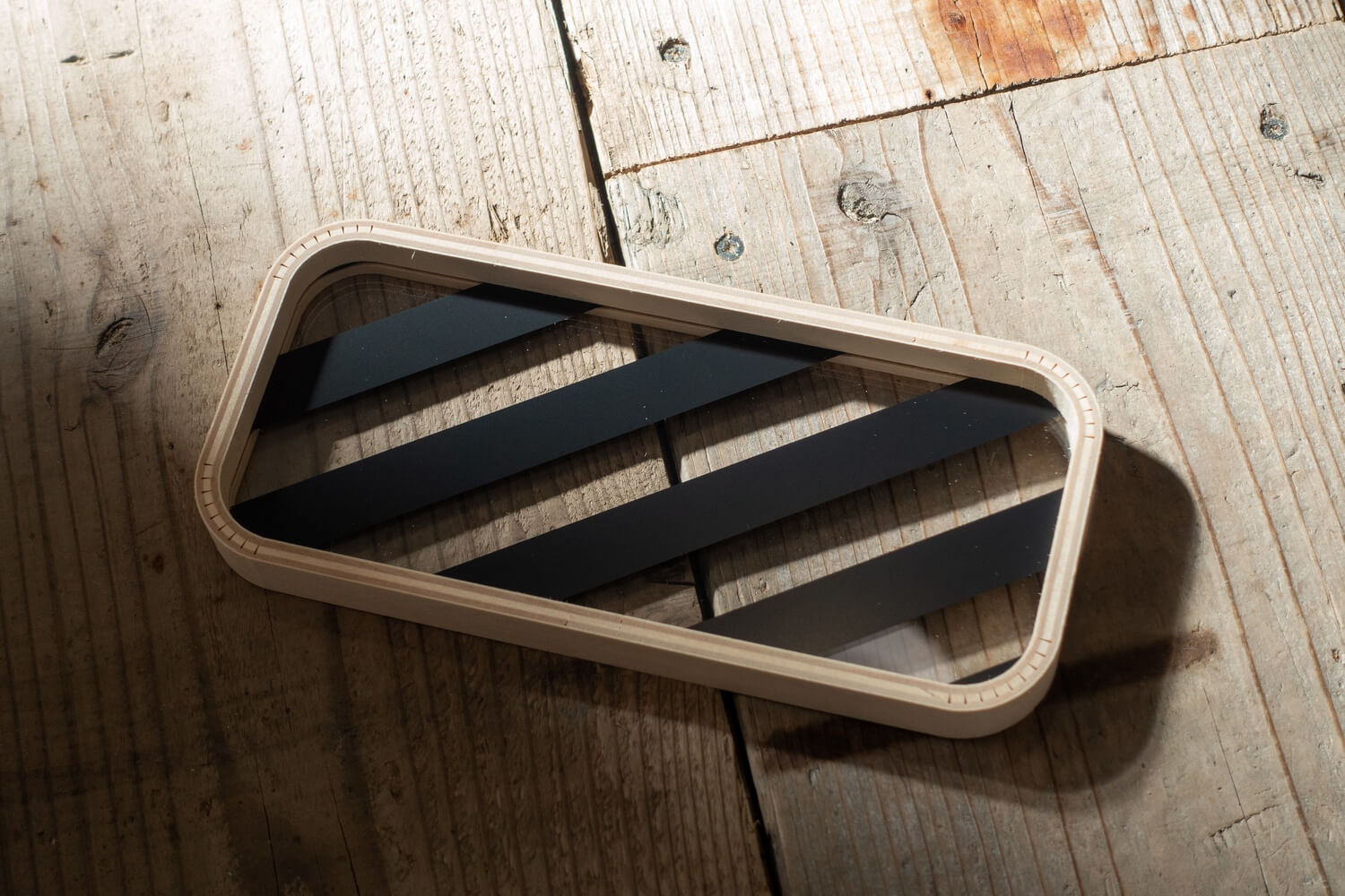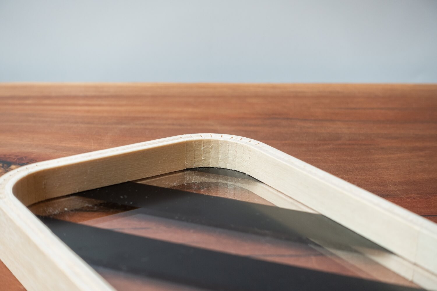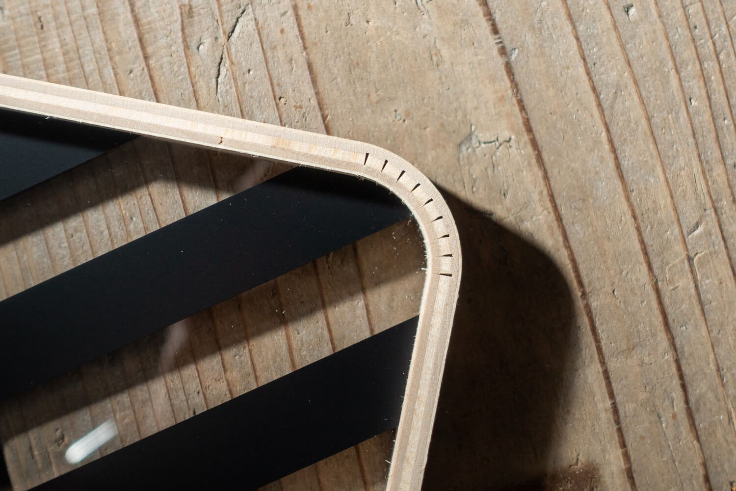 シナ合板を使った木枠は四隅で美しく曲げられ曲線を描きます。