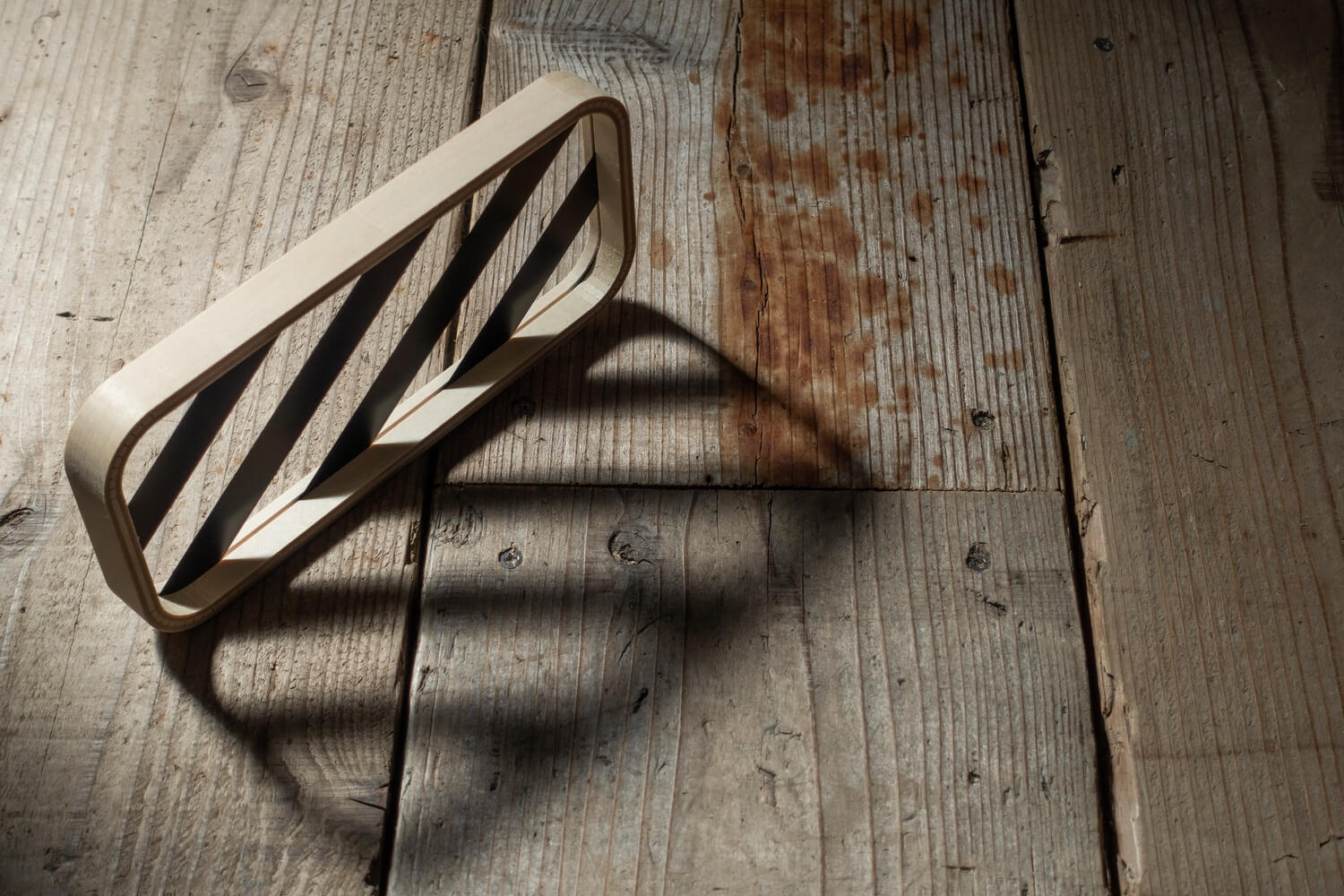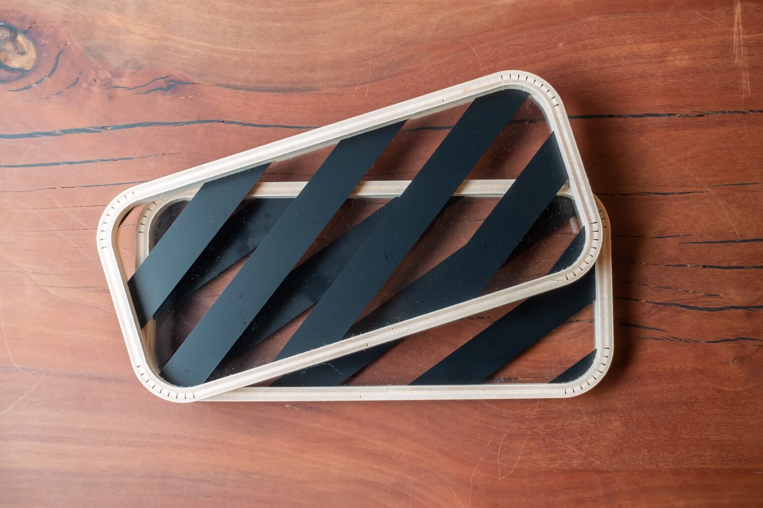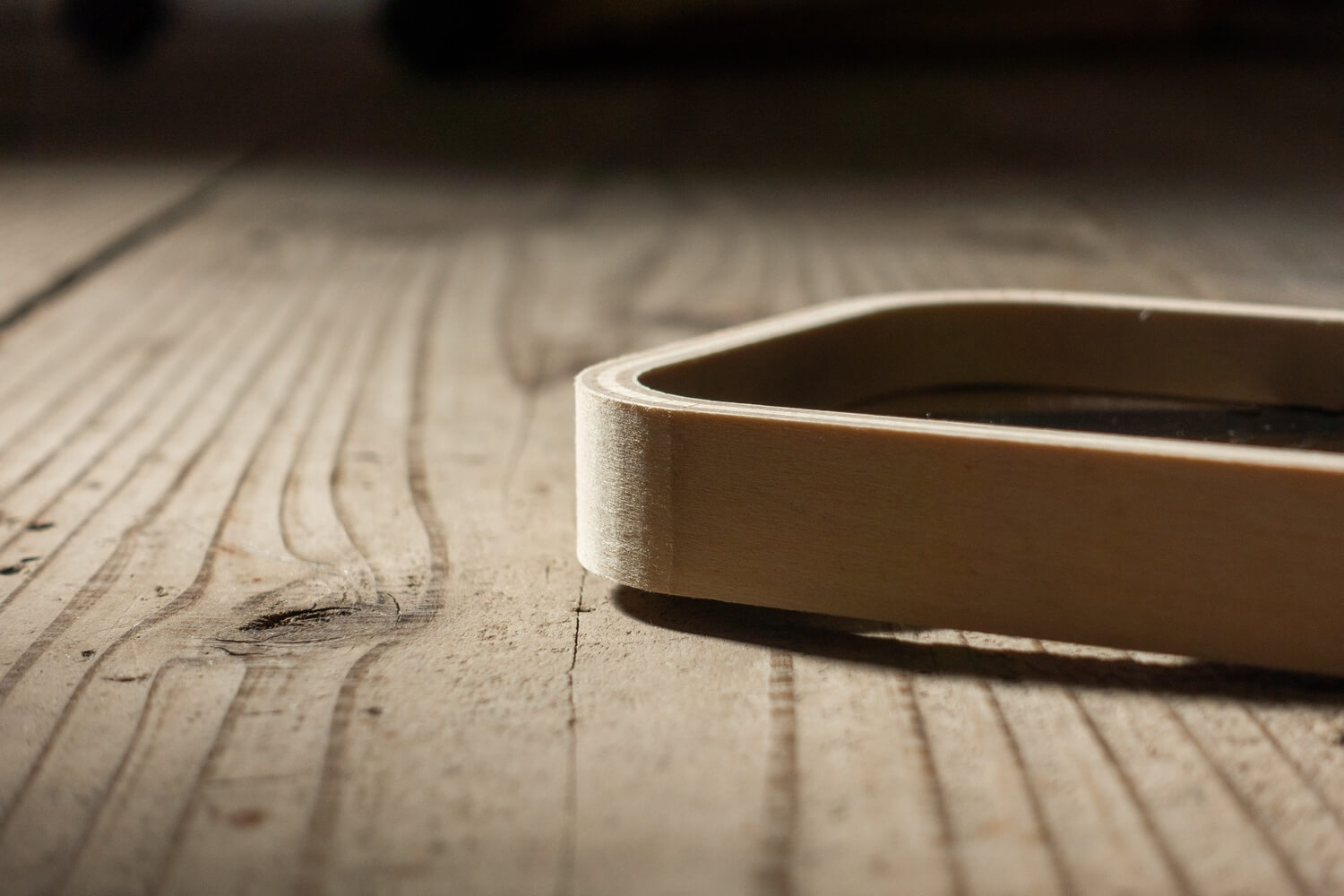 シナ合板を使った木枠は四隅で美しく曲げられ曲線を描きます。