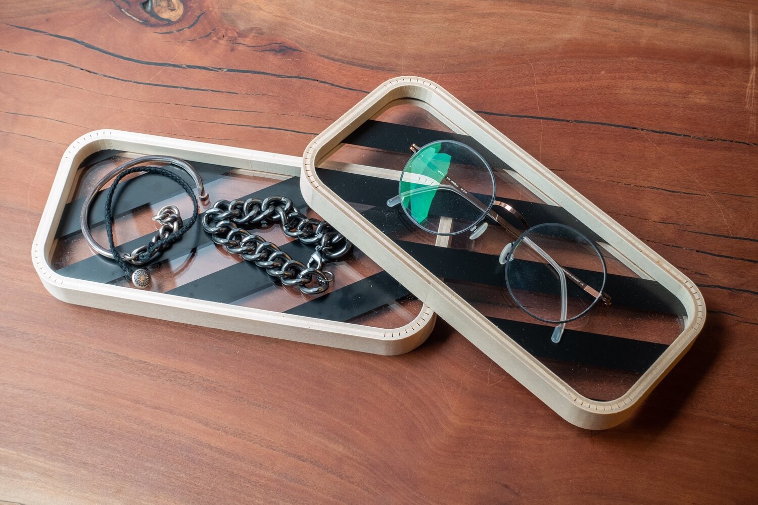 今回紹介するPEN TRAYがこちら。曲線的な木の枠に透明なアクリル板が組み合わさったトレーです。
