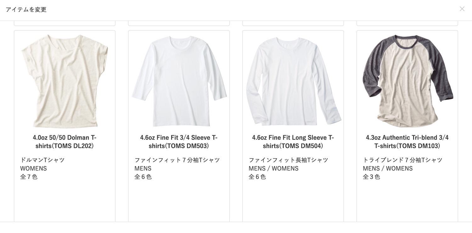 ボディとなるTシャツ生地やタイプ(袖丈/シルエットなど)も様々なバリエーションが用意されています。Tシャツだけでもオンス違いや微妙なシルエットの違いで10種類以上!