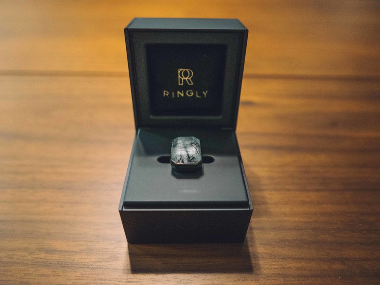 RINGLYはまるで本物のリングのような、四角いパッケージの台座に入っています。
