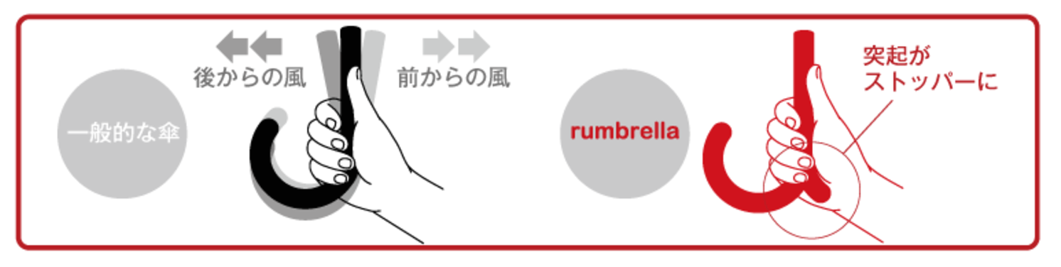 この持ち手の形が小文字の「r」のようになっていることから「rumbrella」という製品名がつけられました。