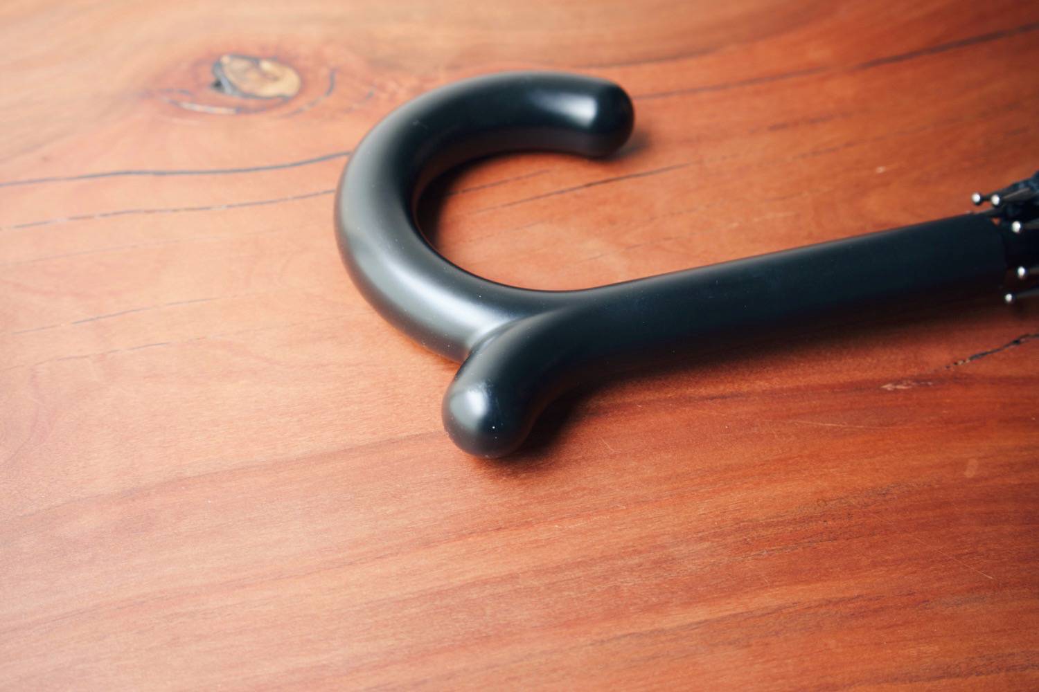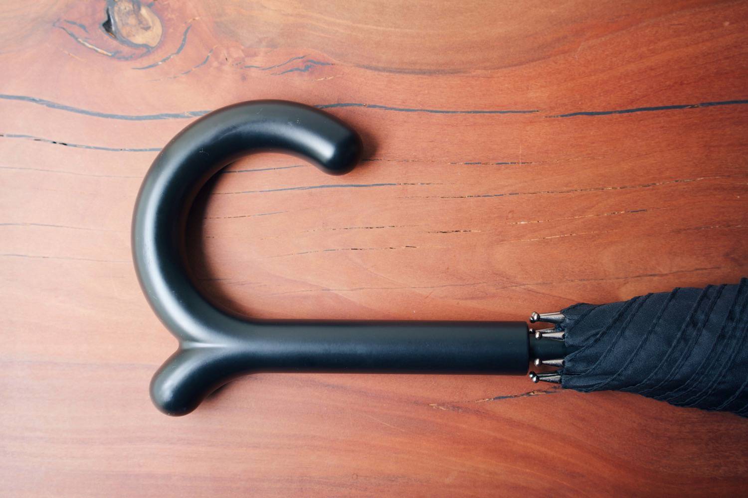 rumbrellaの秘密はこの特徴的な持ち手にあります。通常の傘は軸からまっすぐ曲線を描いてU字になりますが、この傘は途中で柄の部分が二股に分かれています。