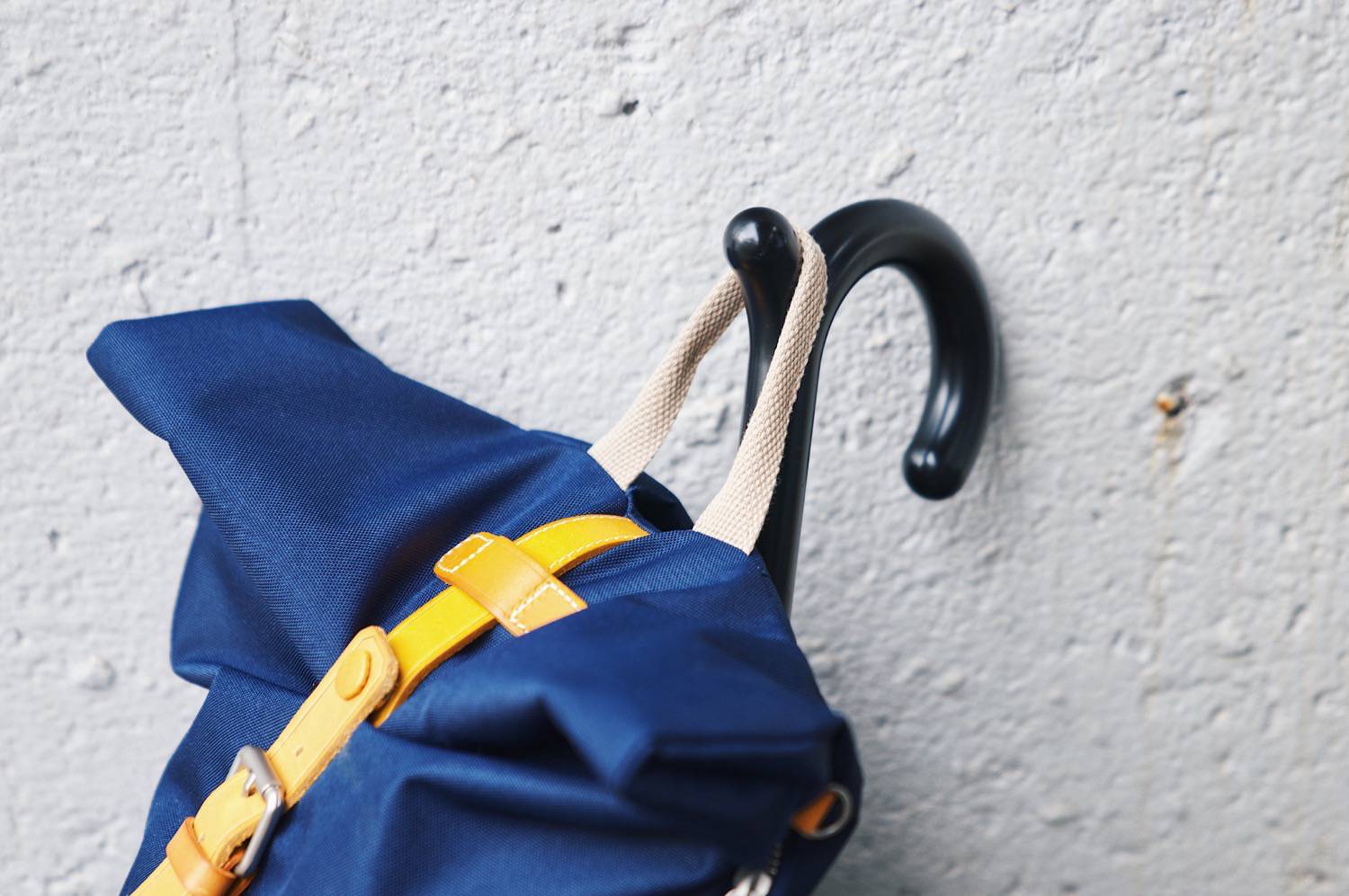 壁や手すりに立てかけておく時でも、バランスを取ればこうやって傘にバッグを引っ掛けたまま置いておくことが可能。雨の日は地面が濡れてしまっているのでこうして宙に浮かせたまま物を置けるのは嬉しい。