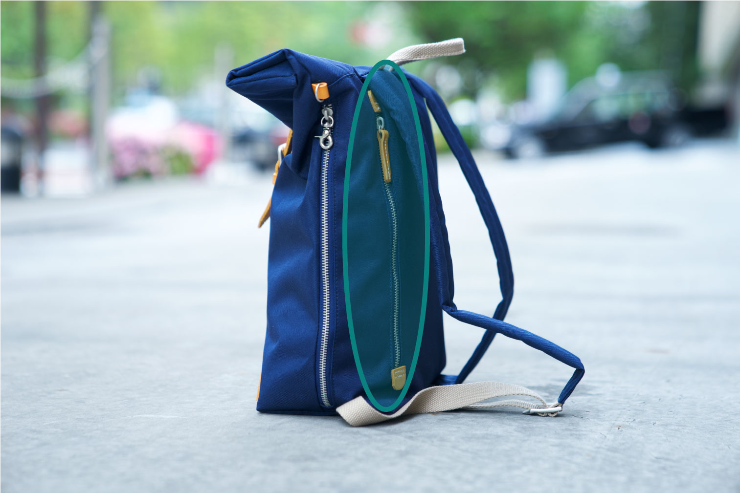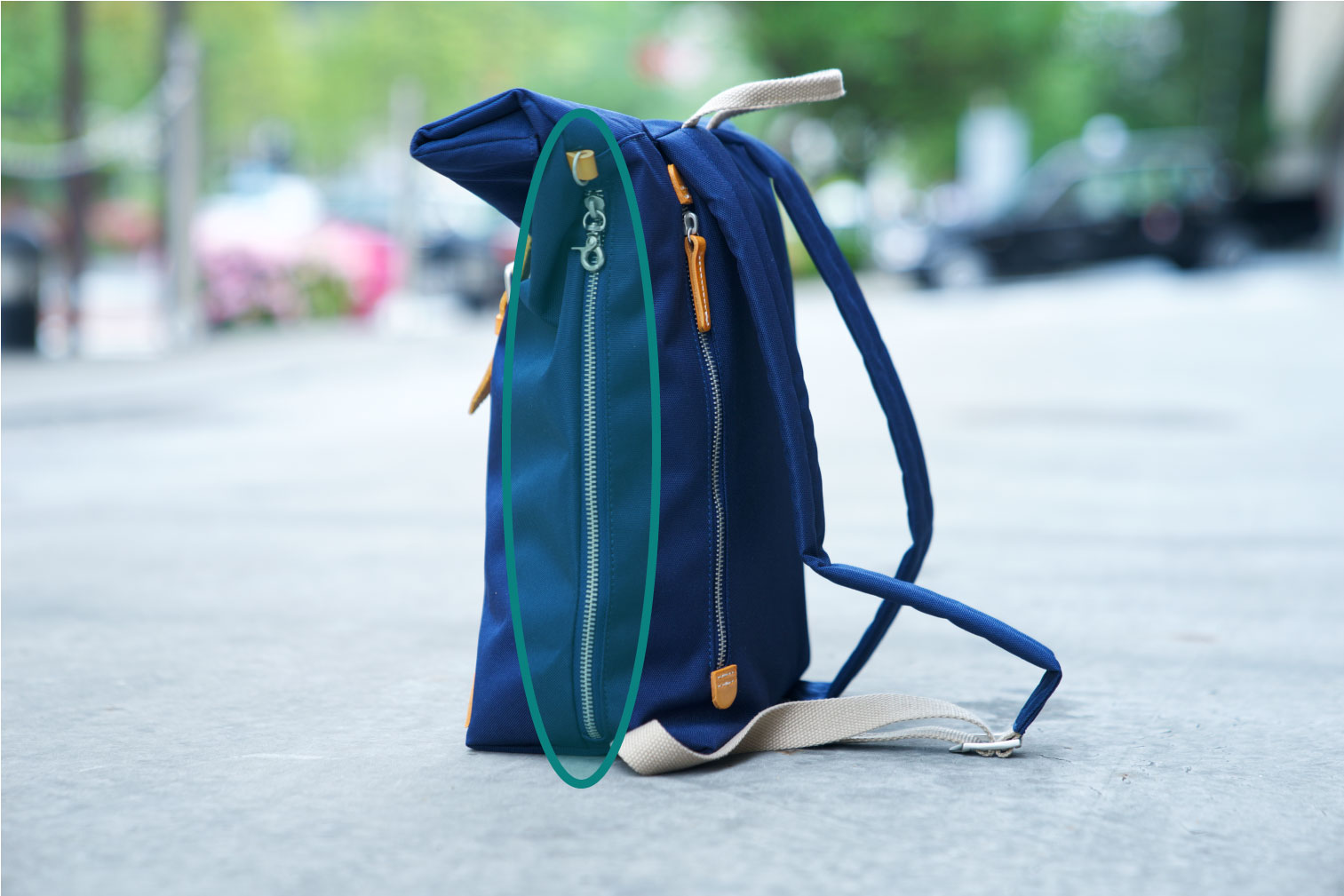 そんな利便性を考え、BROOKLYNのリュックは右サイドにメインルームにアクセスできるジップが付いています。サイドにはジップが2つ付いていますが、画像で丸く囲った方のジップがそれに当たります。