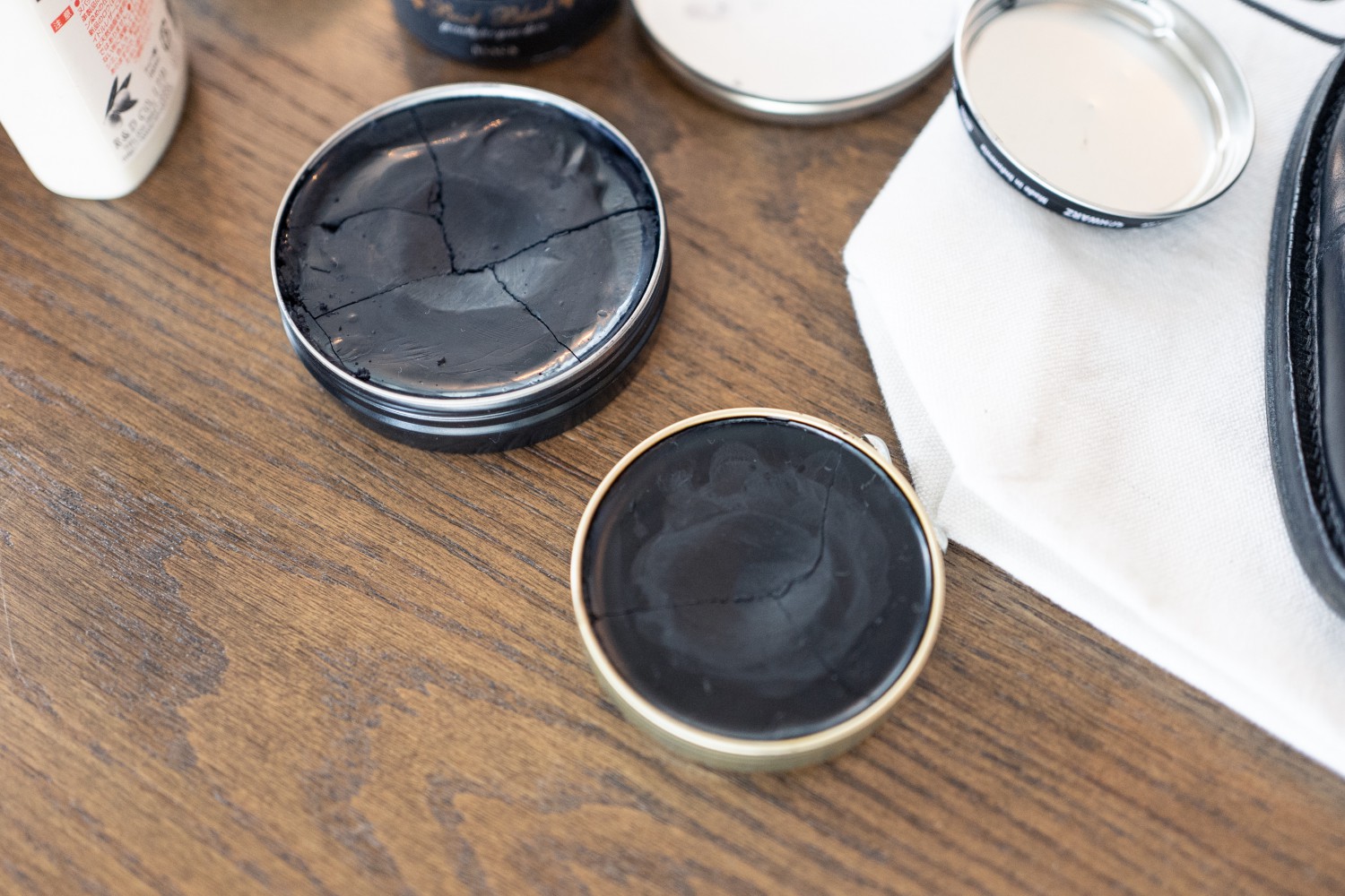 汚れを落としたらブラックのシュークリームを塗り込んでいきます。こひ先生が使っていたのはオススメだというBootBlackというブランドのシュークリーム。