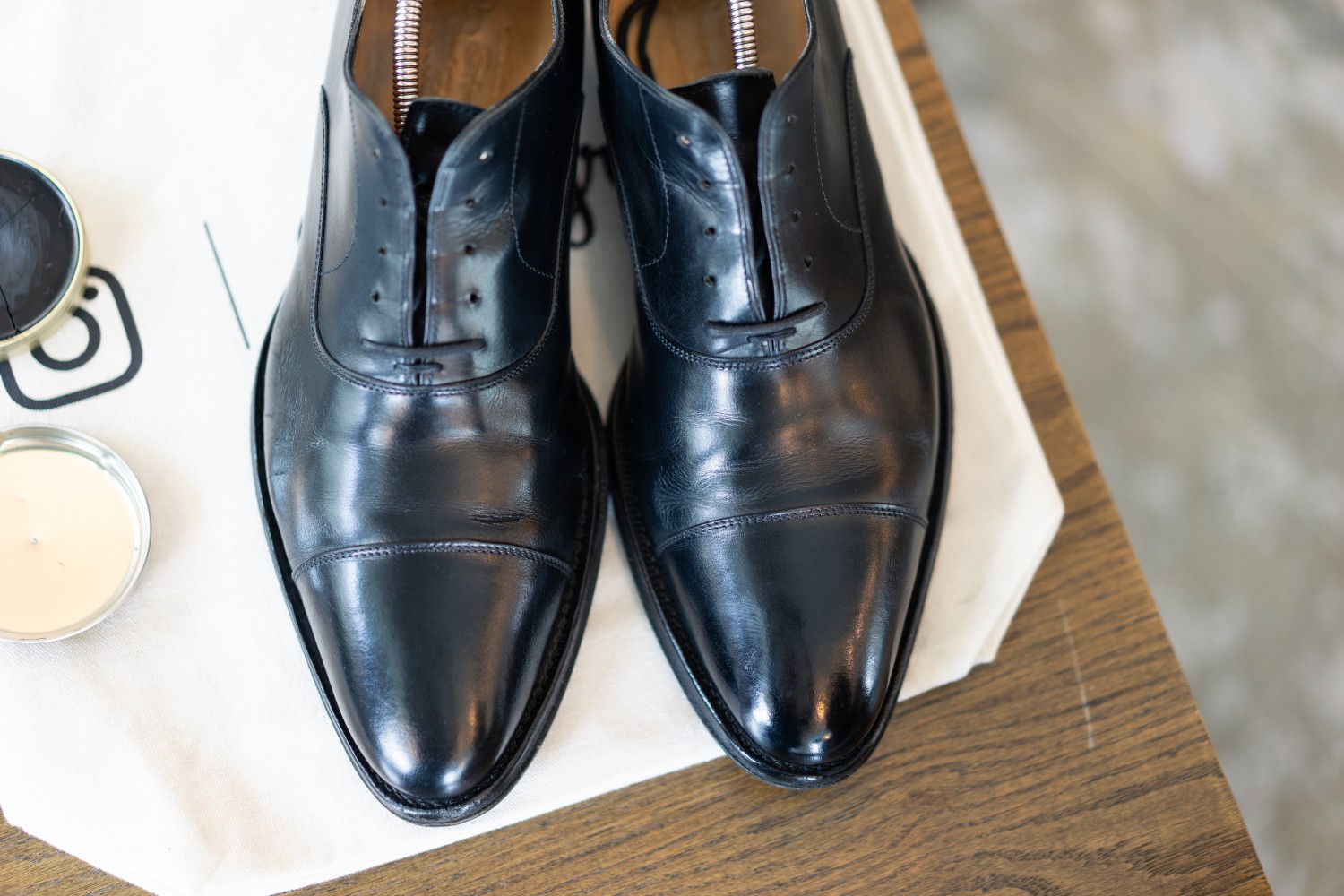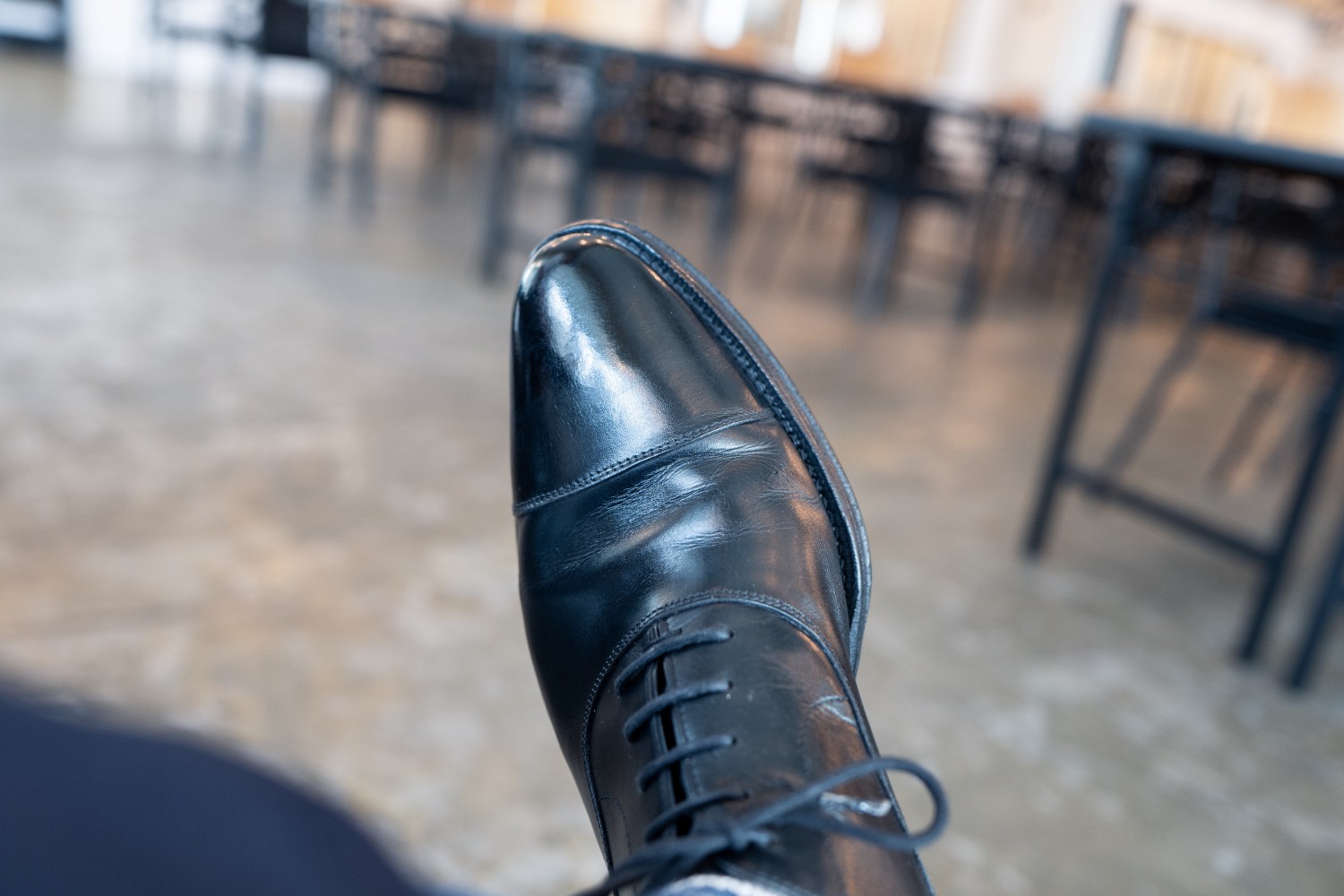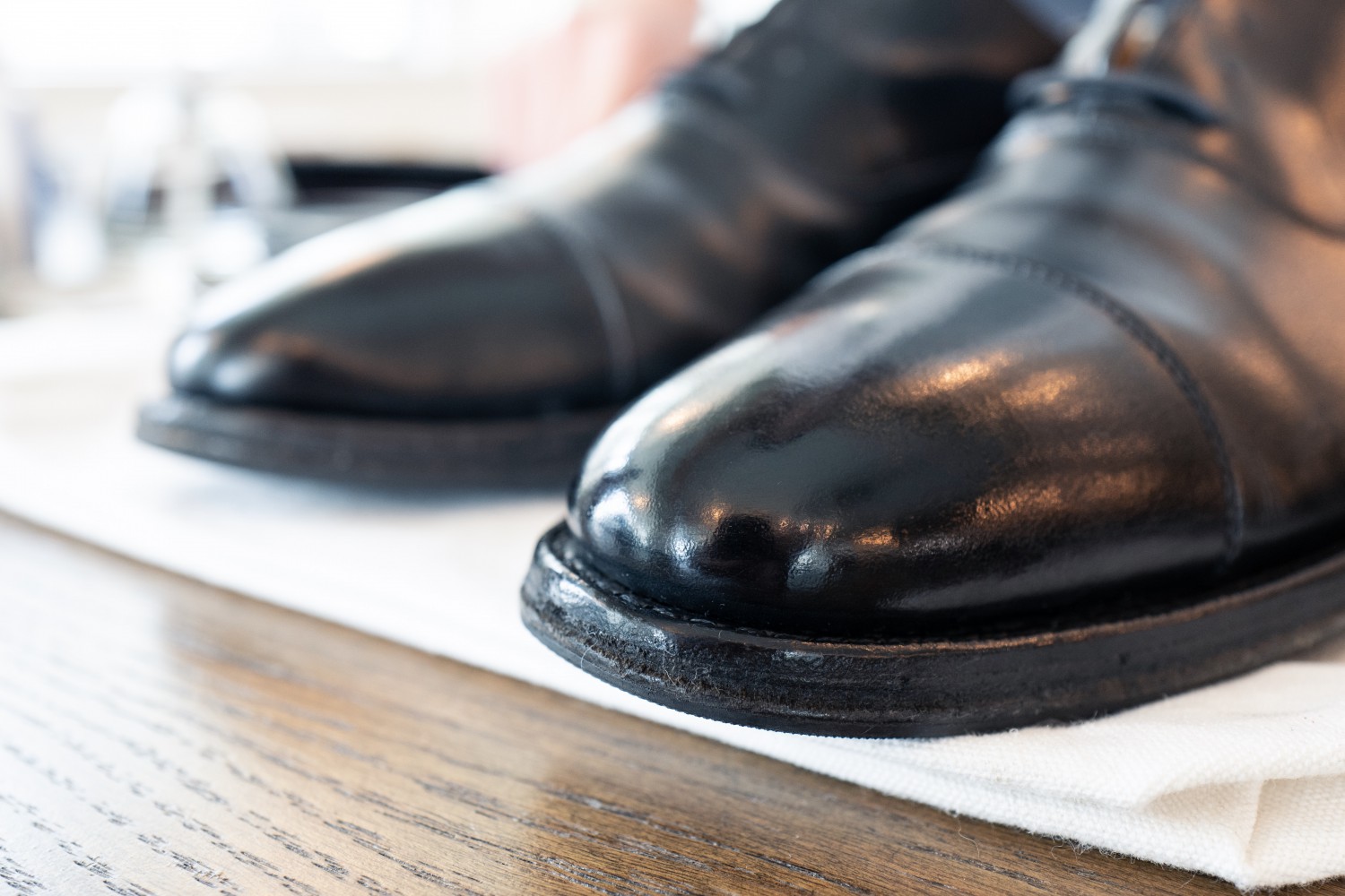 シューケア後の靴はこんな感じ。最初の状態よりも靴に輝きとハリが増しています。道具の違いか細かな作業の違いか、自分でやるときよりも明らかに上品な光沢を帯びています。