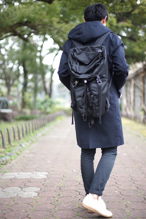 PRADAのバックパックは大きめのサイズ感と金属素材がストリートな雰囲気。「堅牢なナイロン素材を用いている点がお気に入りでガシガシ使い倒している」とのこと。