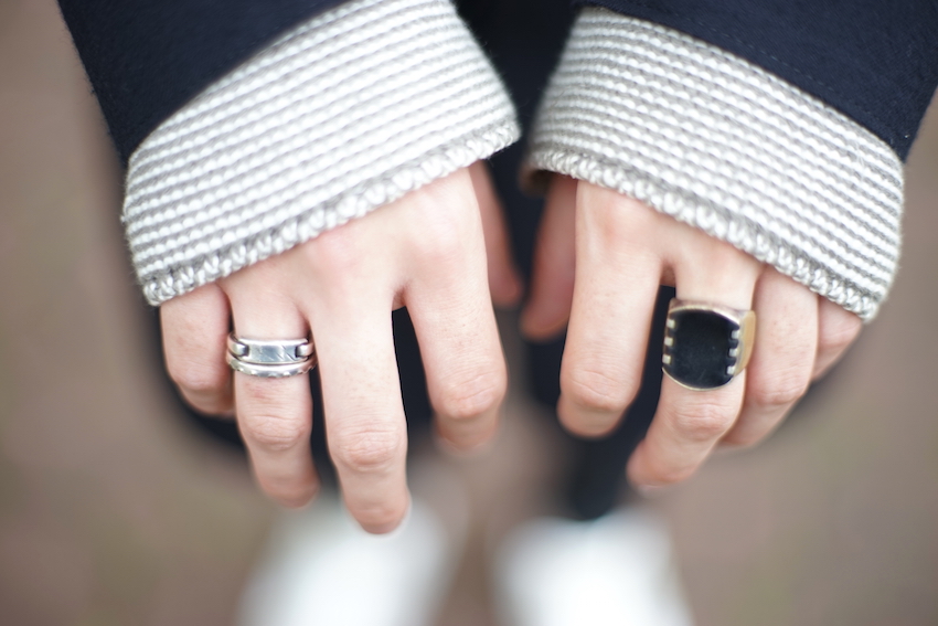 バックパック・スニーカーに加え、指先にはゴツめリングと小物はとことんストリートテイストに。個人的にもリングはあまり付けたことがないので、参考にしたいです。