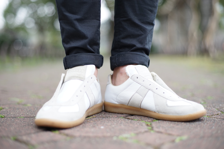 ジャーマントレーナーをモチーフにしたスニーカーは、シューレースが無いゴム仕様とひねりの効いたデザイン。
