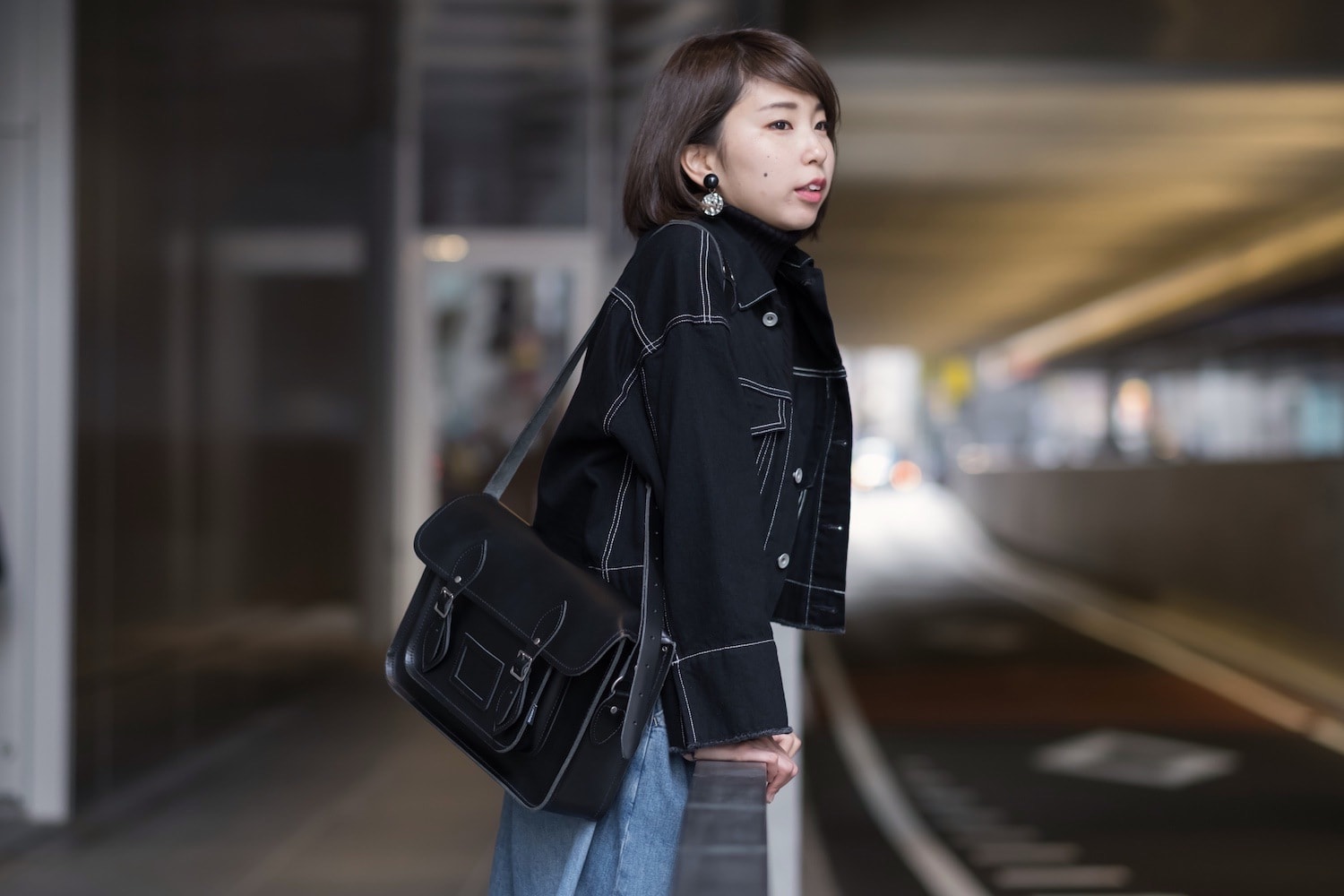 ゆったりしたアイテム同士の組み合わせですが、色味を絞ってシックにまとめたり、タートルネックニットで首元を締めたりとラフになりすぎない工夫が随所に。やや硬めの印象のZatchelsのバッグも全体の引き締め役になっています。