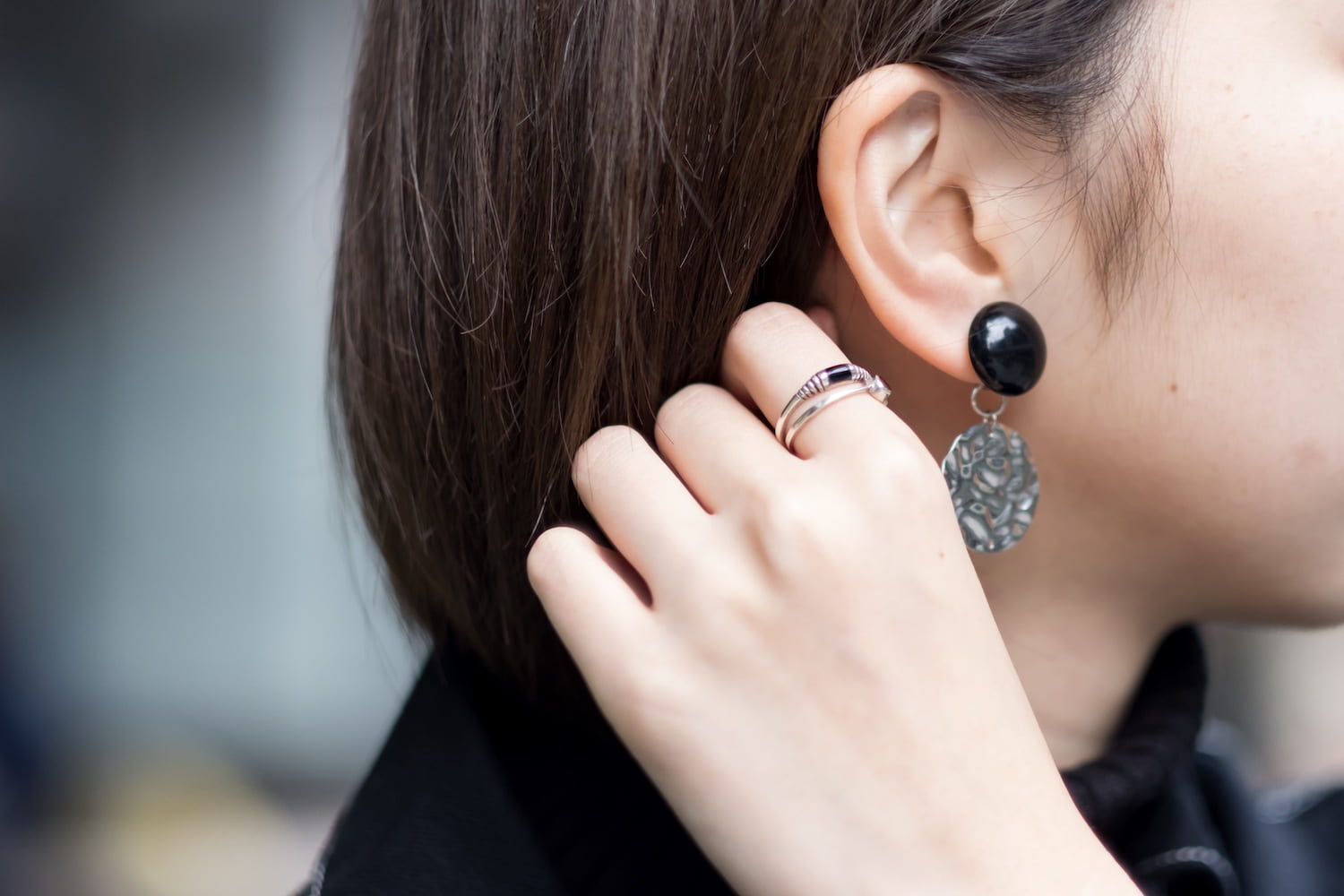 イヤリングは最近始めたアクセサリーブランド「likt」の物で、あんちゃさんの自作。リングはドイツに行ったときにフリマで購入したもの。