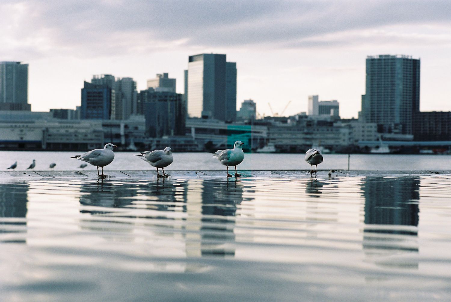 ちょうど夕暮れ時の晴海埠頭。曇りがちな空の表情も手伝って雰囲気の良い写真が撮れました。