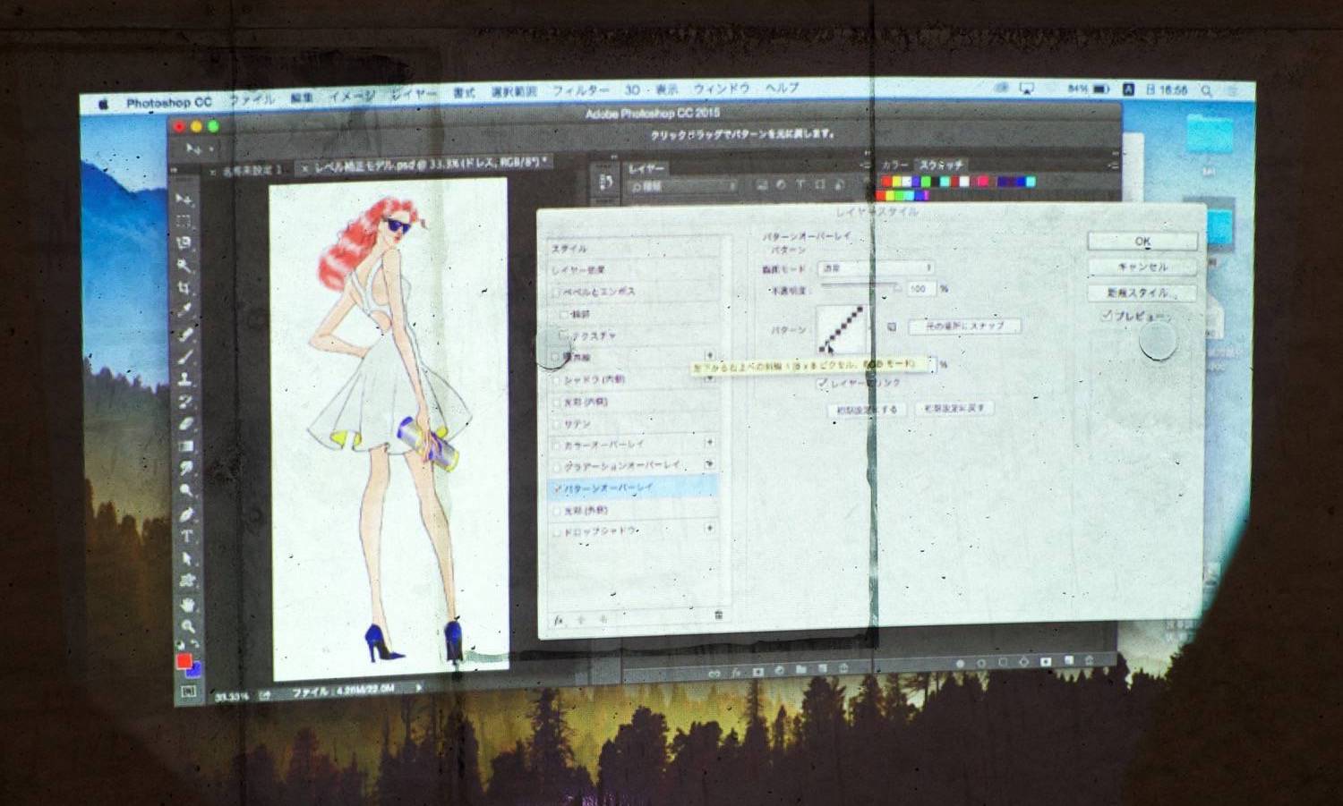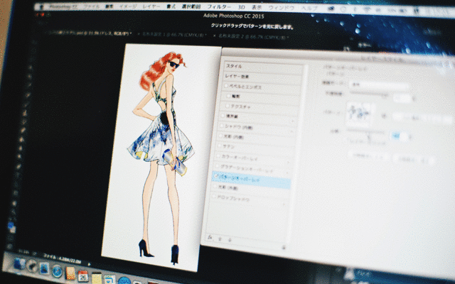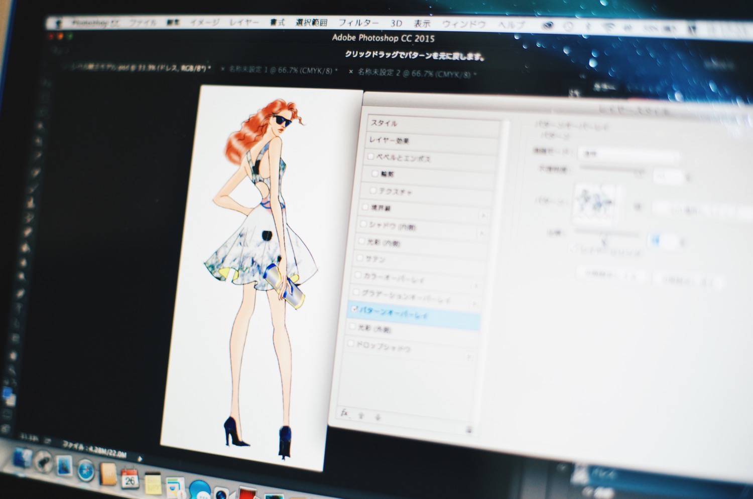 先ほど描いたイラストを「パターン」素材として登録し、それを先生が描いたワンピースのレイヤーにテキスタイルとして落とし込むと…