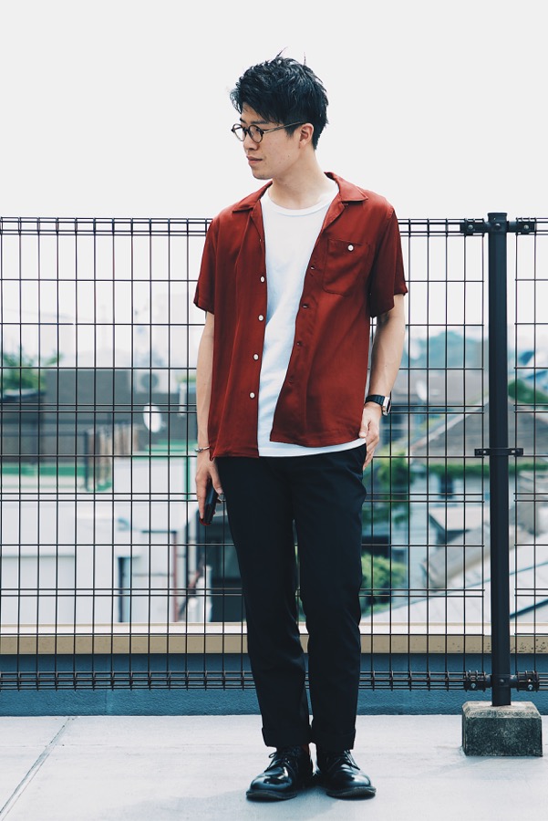 以前にもコーディネート記事で紹介しましたが、着用するとこんな感じ。このシャツが圧倒的主役なので他はシンプルにまとめています。ボタンは全部開けてラフな感じで着ています。
