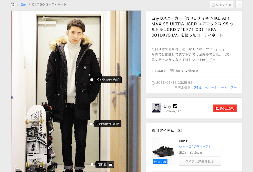 写真はぼくもフォローしているWEARISTのEnyさん。ストリートっぽい服装でいつもめちゃめちゃおしゃれです。