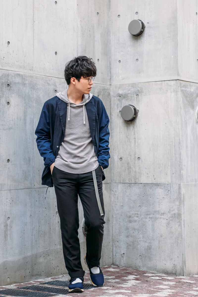GANRYUのゆったりしたナイロンジャケットに、JAMES PERSEのパーカーを合わせました。