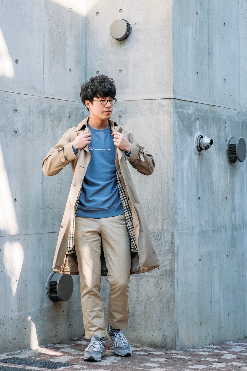 いつもと違う格好に挑戦してみた理由は、417 EDIFICEで買ったChampionのスウェット。この鮮やかなブルーに一目惚れして購入しました。