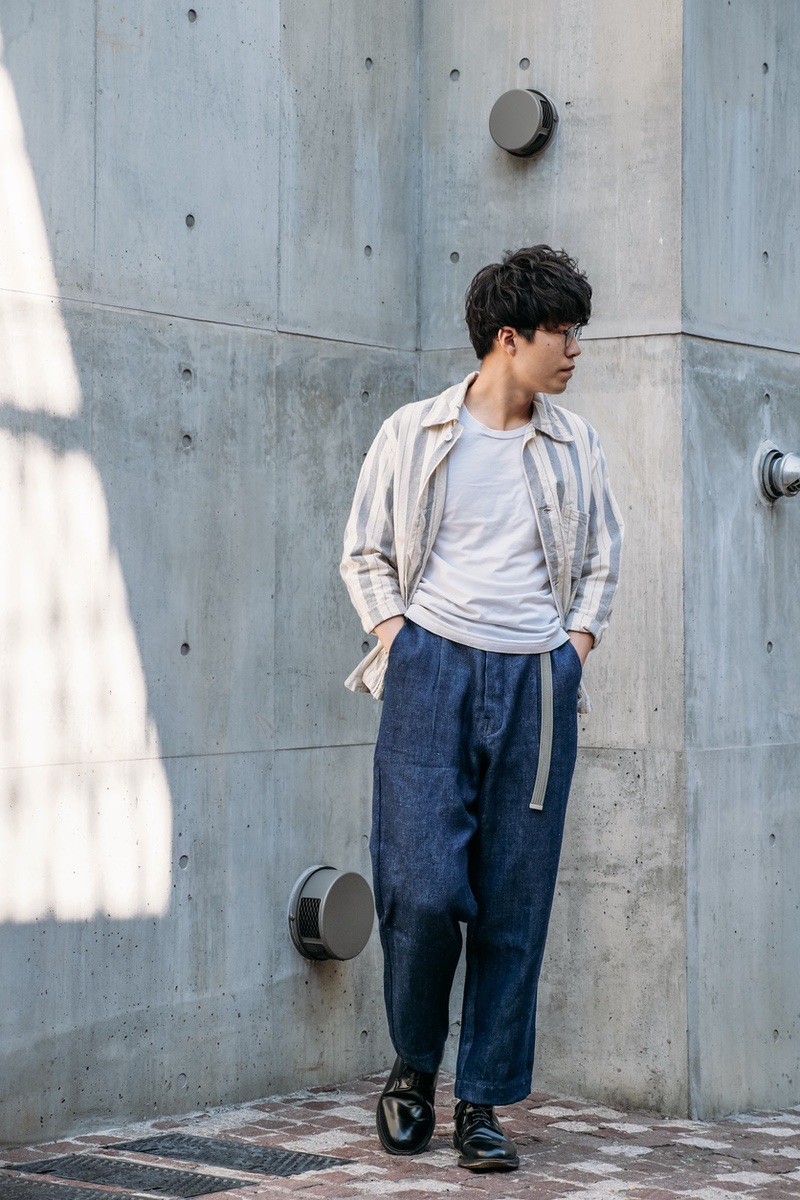 この日もevan kinoriのデニムパンツを履いてコーディネート。ゆったりしたシルエットでストリート感を意識してスタイリングしてみました。