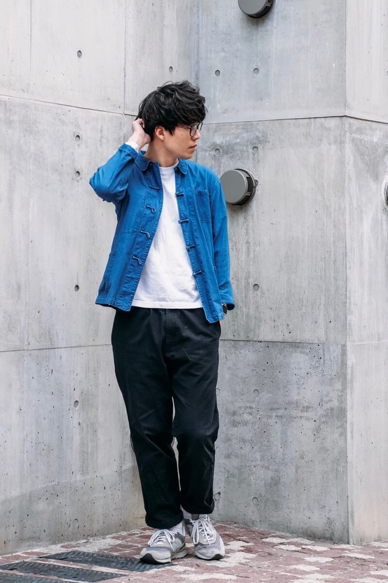 古着で購入した60’s古着のチャイナシャツを中心にコーディネート。