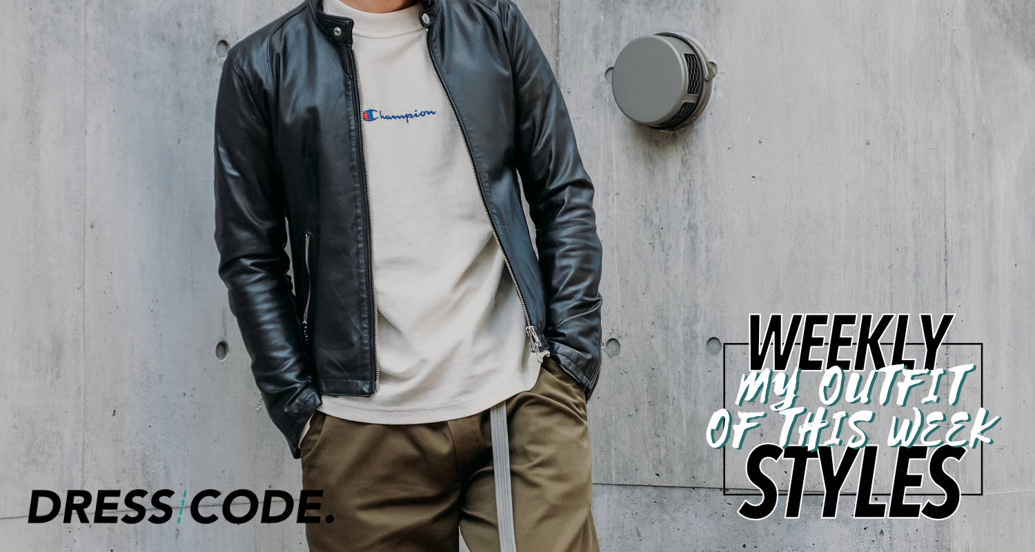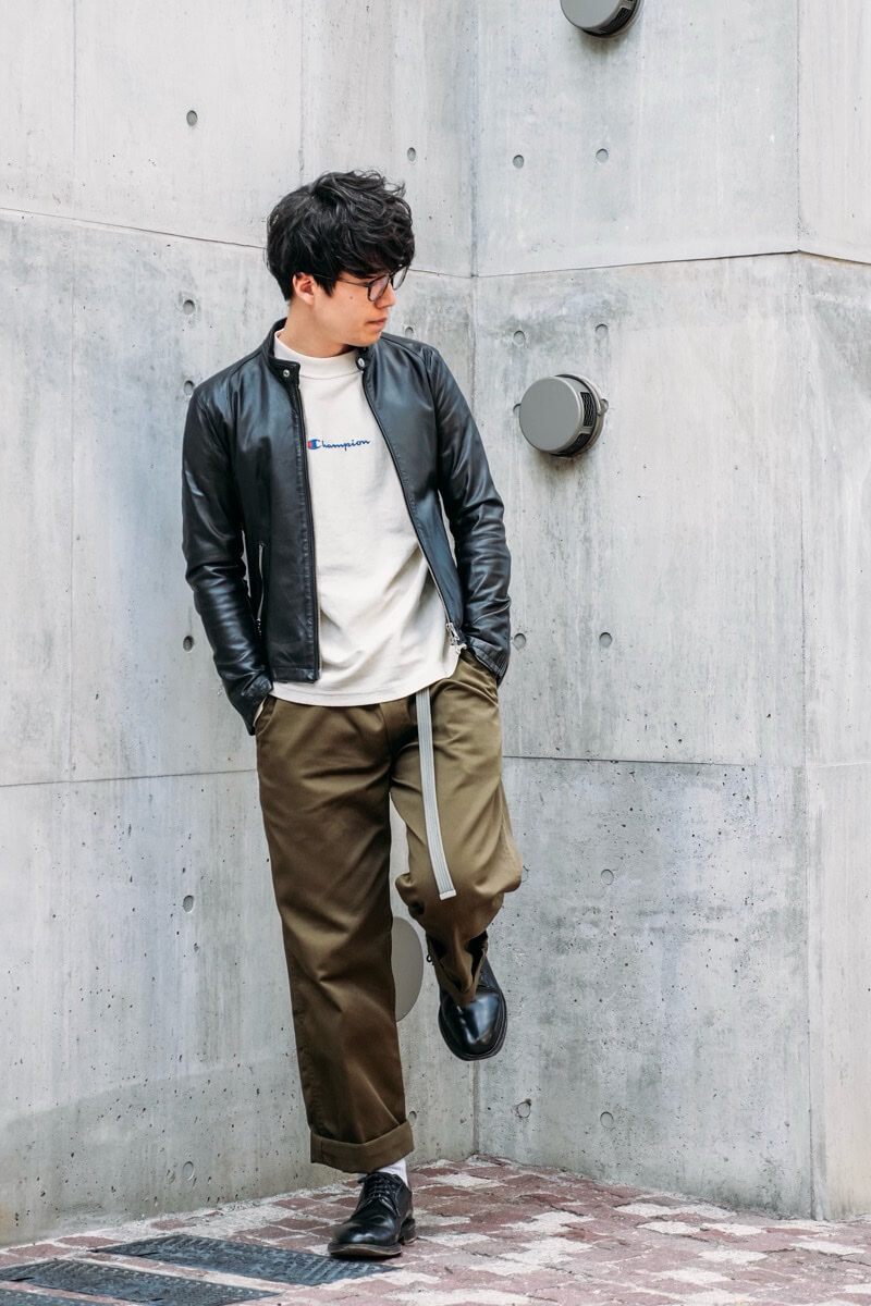 この日はライダースジャケットにオリーブグリーンのチノパンを合わせて、ミリタリー感のあるアメカジスタイル。