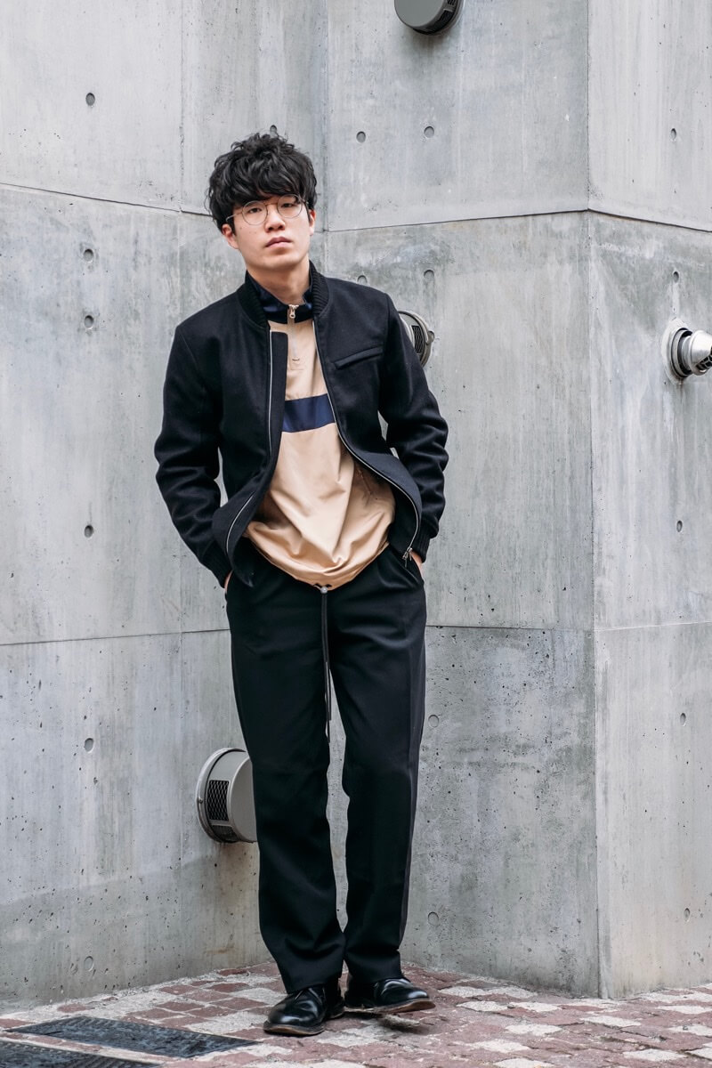ゆったりしたワイドスラックスに、ナイロンプルオーバーを合わせてモード×スポーツなテイストに。黒×ベージュの色合わせっていいですよね。