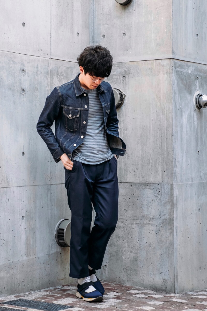 濃紺を中心に色数を絞って、落ち着いたカラートーンでまとめました。MARNIのネオプレンスニーカーをアクセントに。