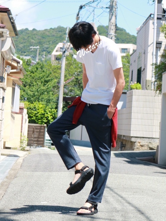 このコーデでは腿あたりまでボトムスをまくって軽快さを出したり、ビビッドな赤いスニーカーを合わせることでオシャレさをプラス。