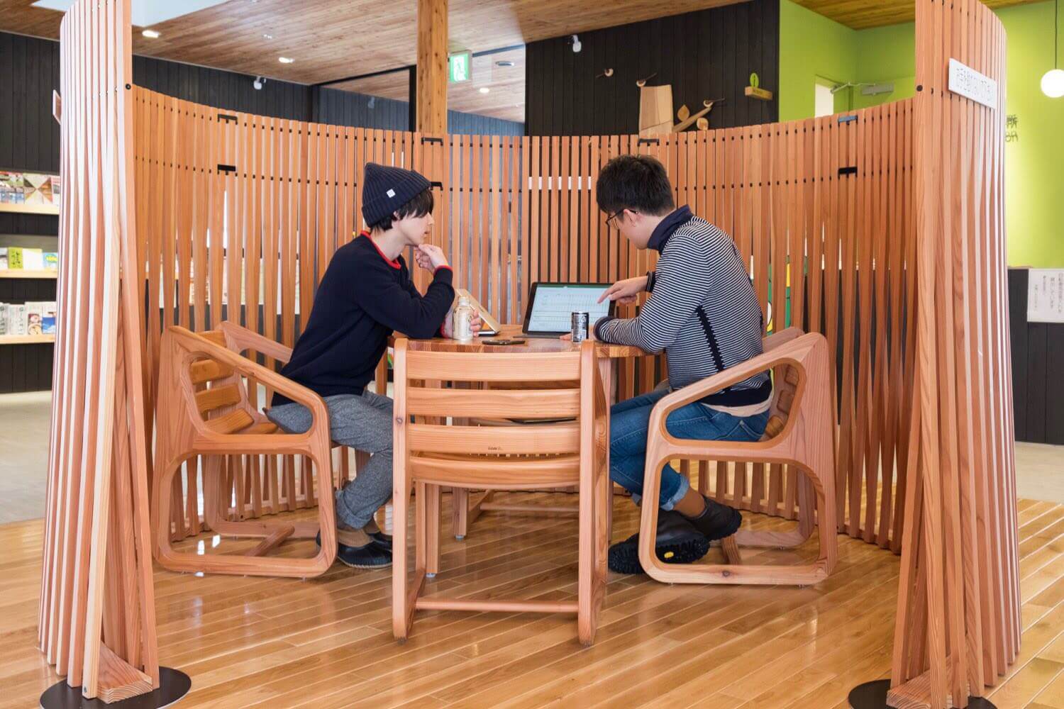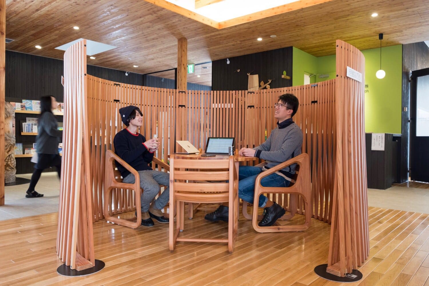 まちおこしセンター「コモレビ」は、建物の中にパーテーションで区切られた部屋やフリースペースが充実した公営施設。