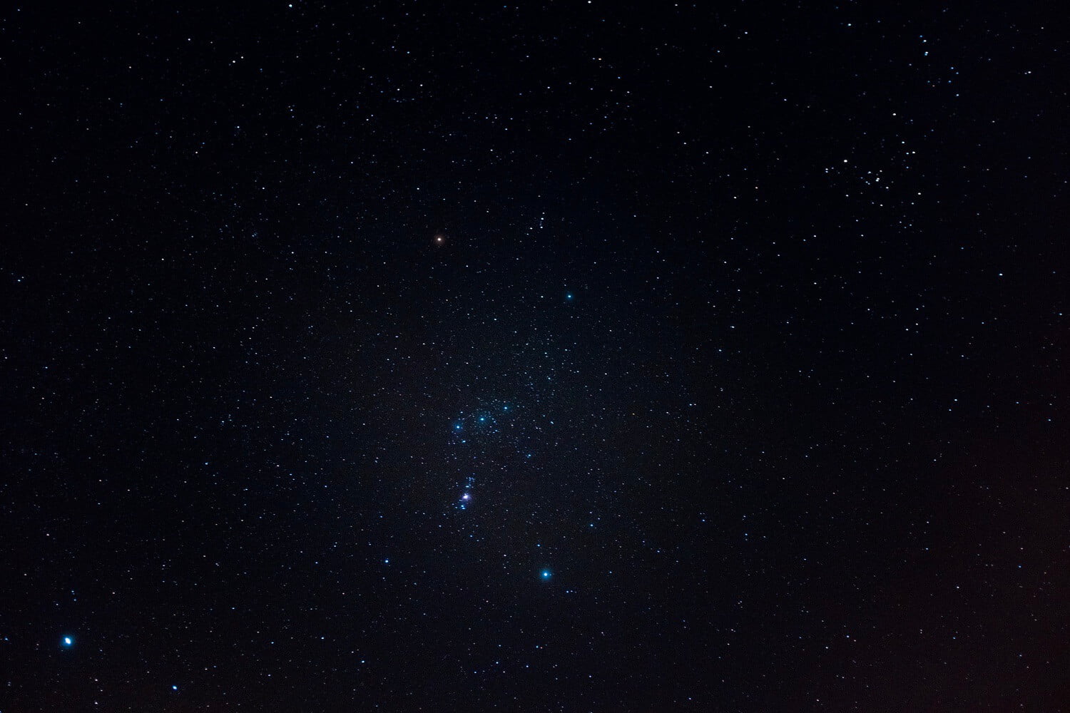 銭湯からの帰り道、見上げると空には目視でもわかるほどたくさんの星が。湯冷めしそうな極寒の中、みんなで急いでカメラを持ち出して星空にカメラを向けました。オリオン座がこんなにもしっかりと見えます。